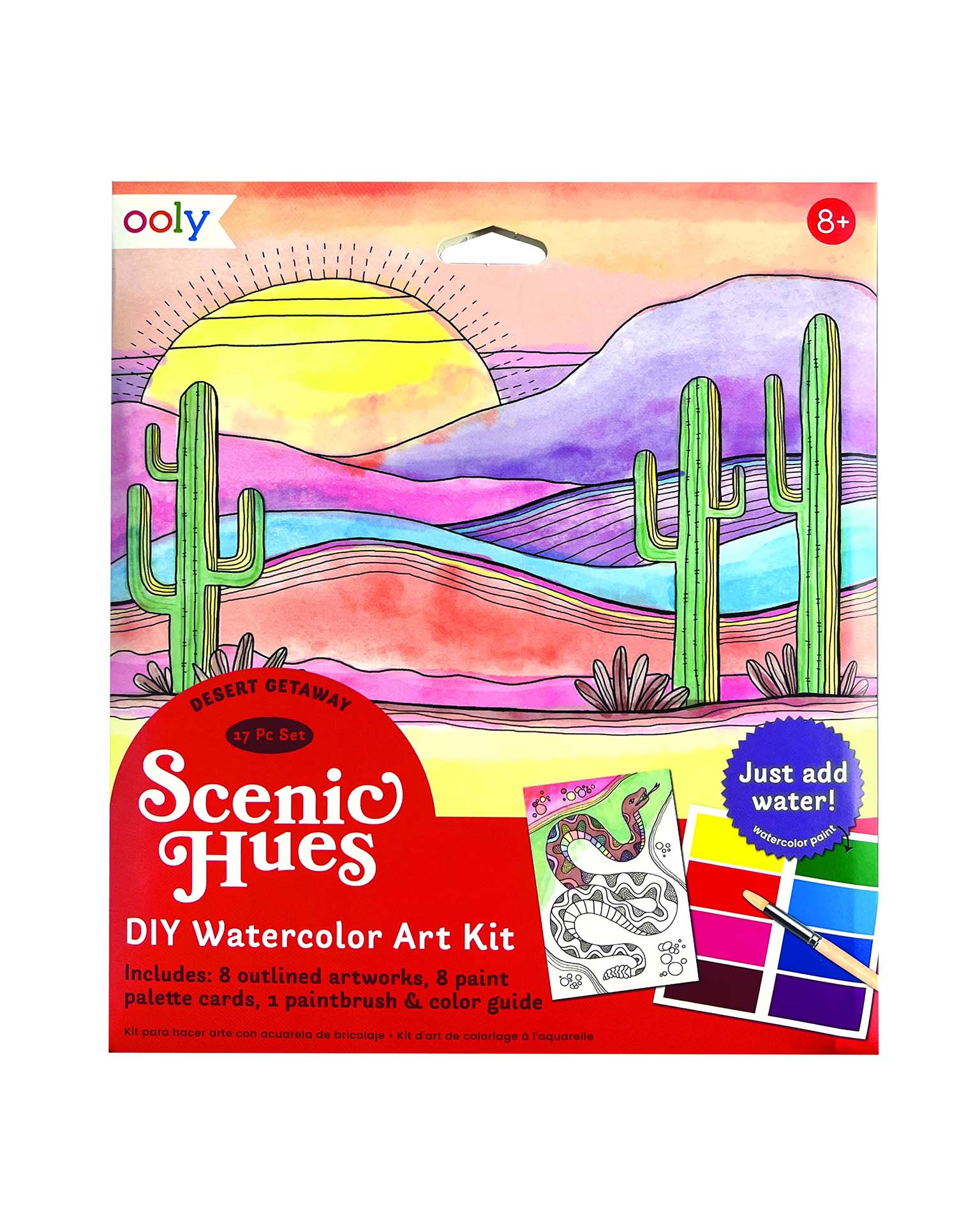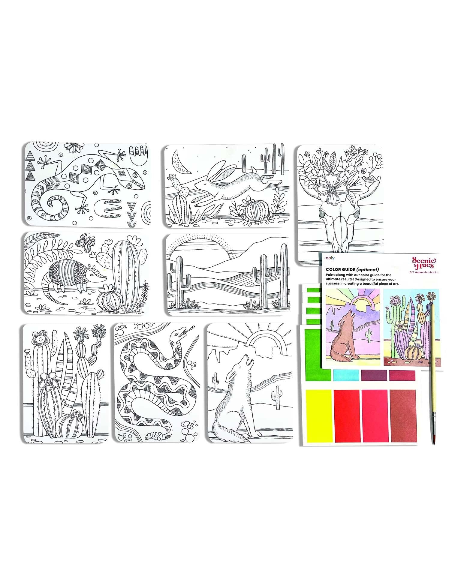 - Kit includes 8 different watercolor postcards, 8 paint palettes, 1 paint brush, and a color guide
