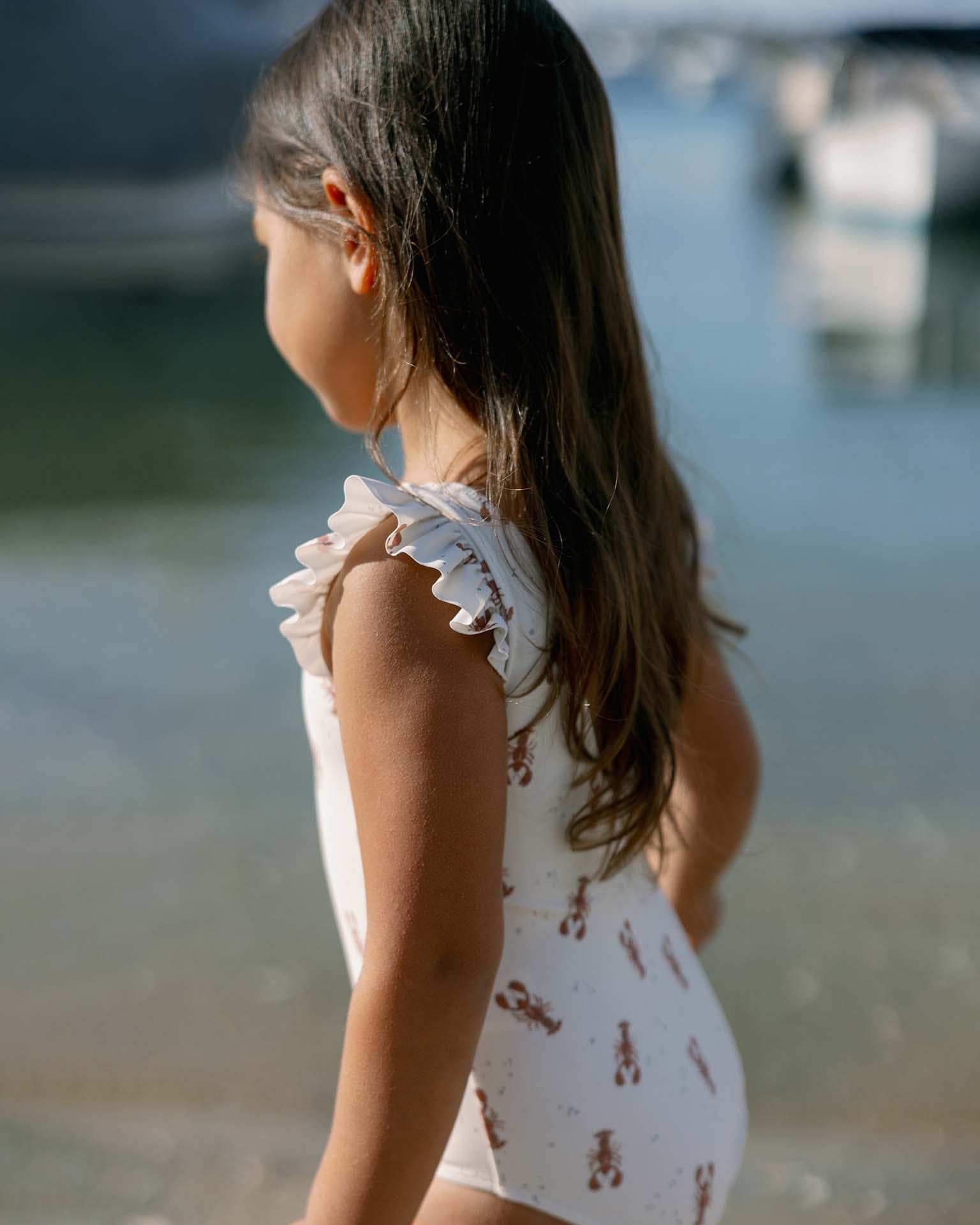 This one-piece swimsuit features sweet ruffled sleeves and snaps at the bottom for easy changing. All Rylee and Cru swimwear is UPF 50+ so you can stay protected from the sun in style.