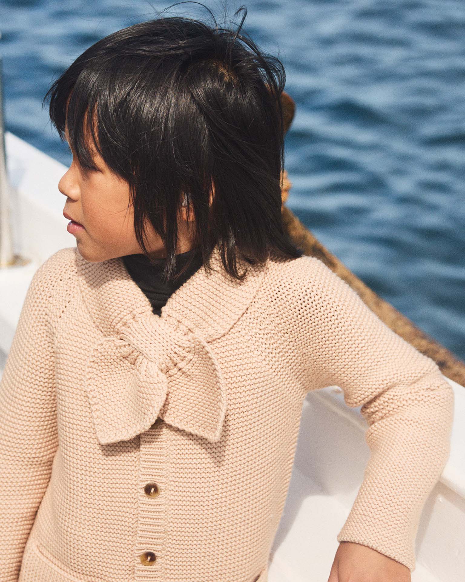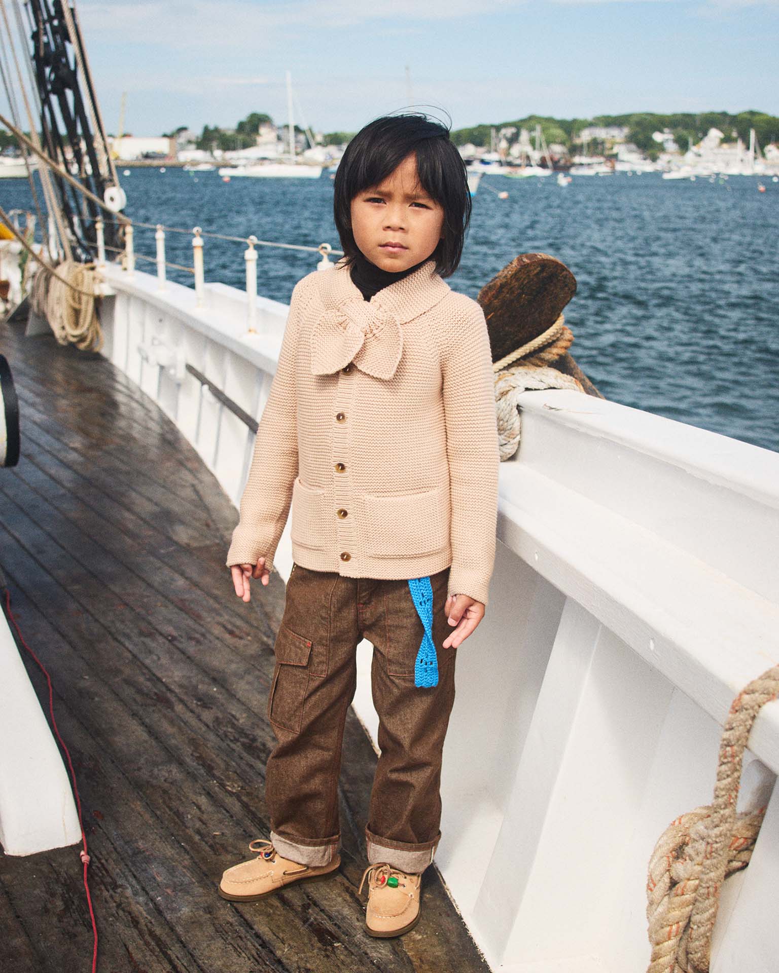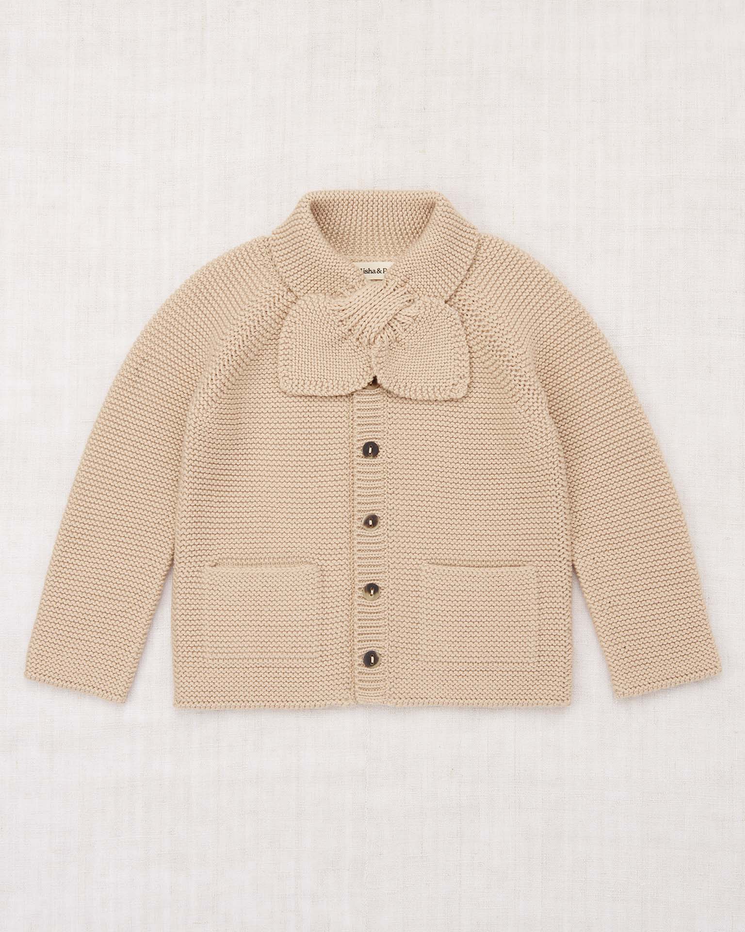 Inspired by Misha & Puff's signature Scout Top, a jacket-style cardigan in a Merino wool knit. Featuring the Scout pull-through kerchief, two front patch pockets, and horn button closure.