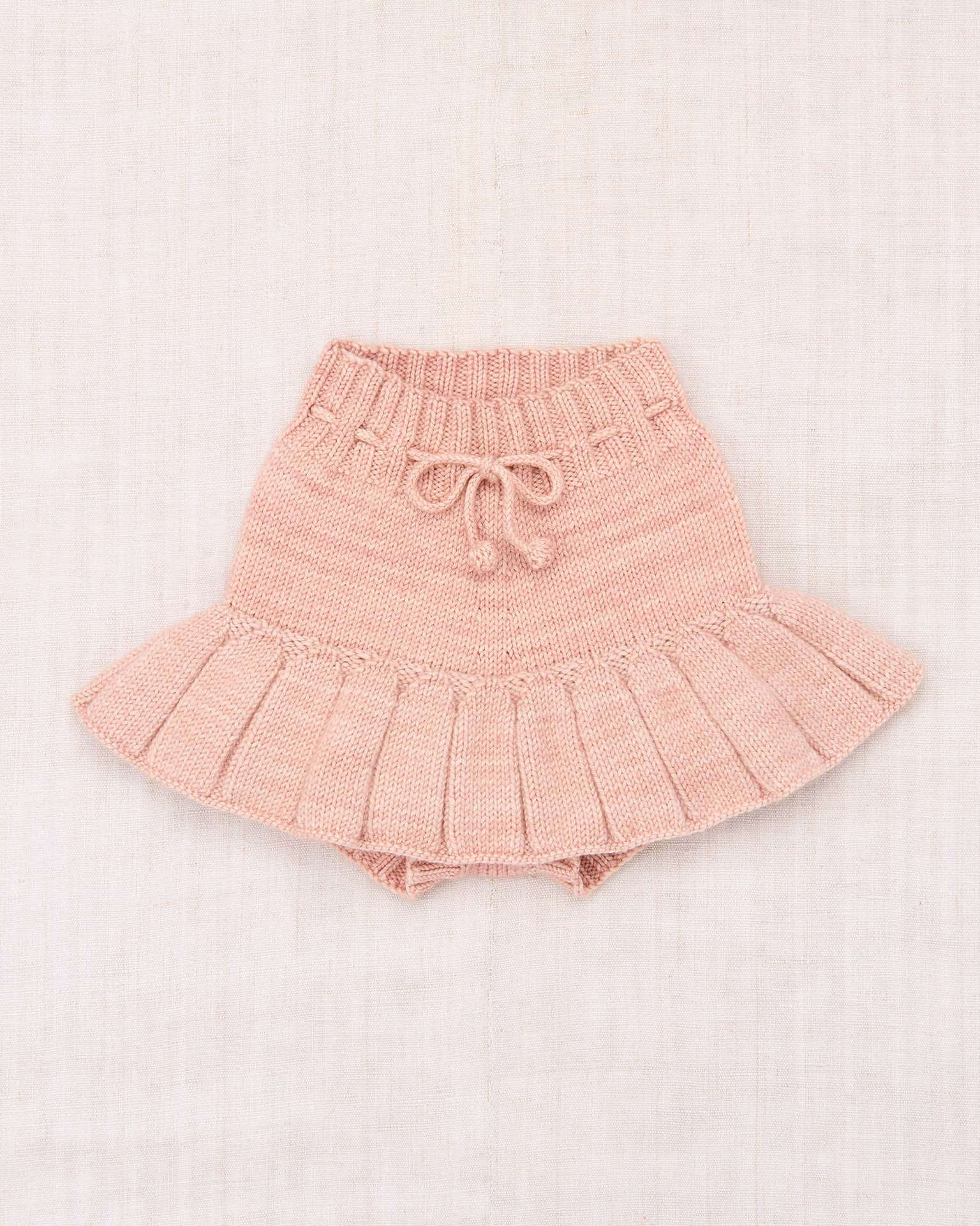 A hand-knit skirt in Merino wool, featuring attached bloomers with ribbed cuffs and a ribbed waistband with a popcorn tie drawstring for a secure fit.