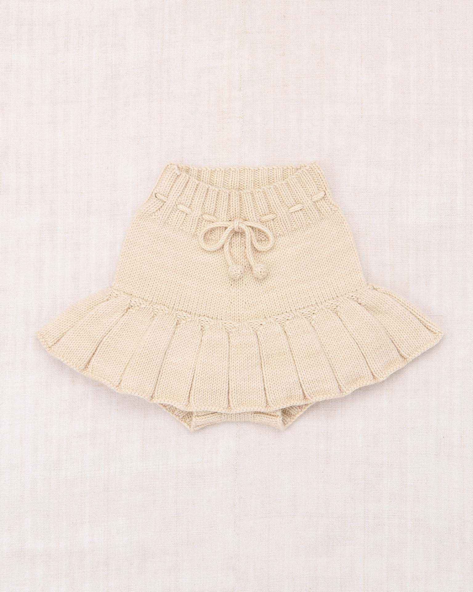 A hand-knit skirt in Merino wool, featuring attached bloomers with ribbed cuffs and a ribbed waistband with a popcorn tie drawstring for a secure fit.
