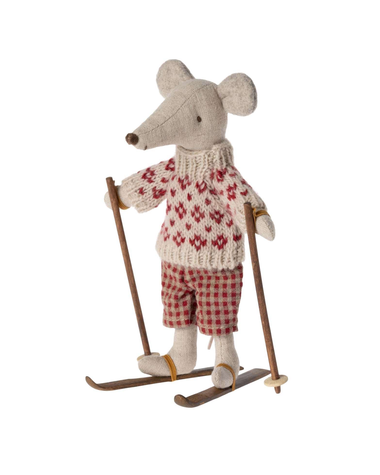 The perfect winter activity in the snow. With this set your mice can have a lovely day on the slopes. Ski and poles are made in wood and the elastic band makes it easy to fasten on mouse feet and paws. Fits Mum and Dad size mice.