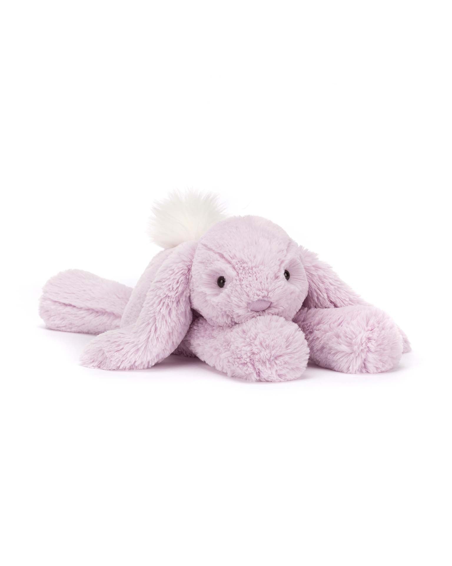 Smudge Lavender Rabbit is the perfect pastel pal. Scrumptiously soft in lavender fur with a fluffy cream bobtail, this lop-eared bunny has trumpet legs and a soft tum for the most luxurious of cuddles. This little rabbit is a loving companion, and the perfect gift for all ages.