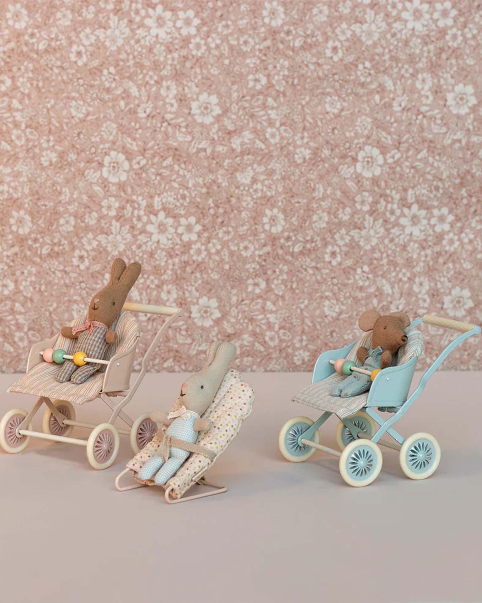 This stroller is perfect for mouse families with more than one baby. You can easily transport two or three babies. The seat can be positioned both ways depending on whether the babies like to look at mum and dad or are ready to discover the world.
