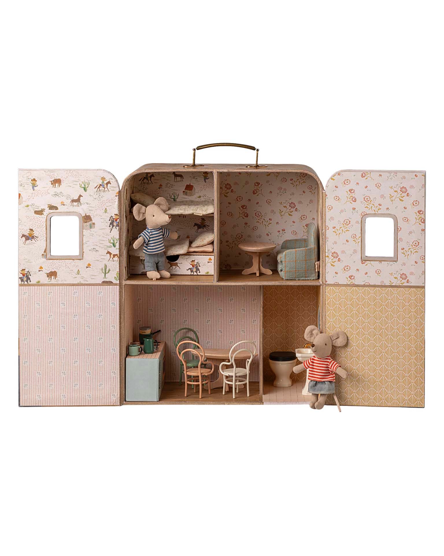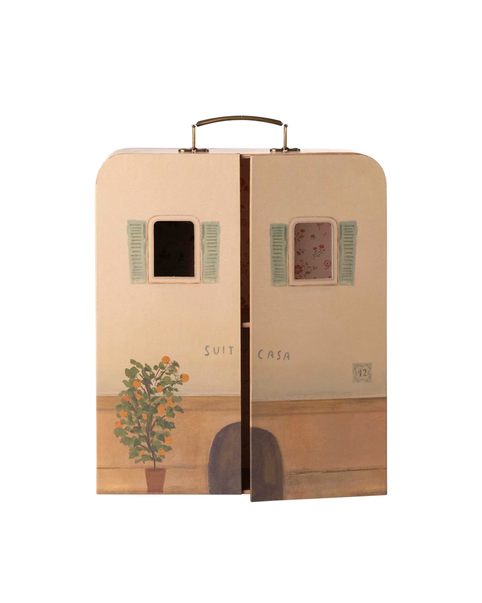 Welcome to SuitCasa - a small portable house. It fits the size: little brother and sister mice. 2 sets of soft bedding for your friends are included but you can buy several of other small furnitures to decorate the house.