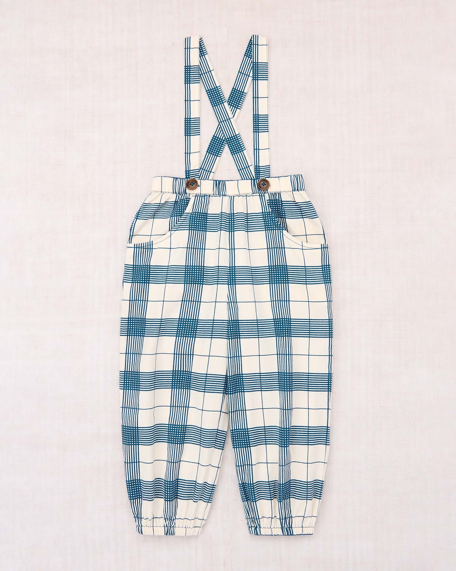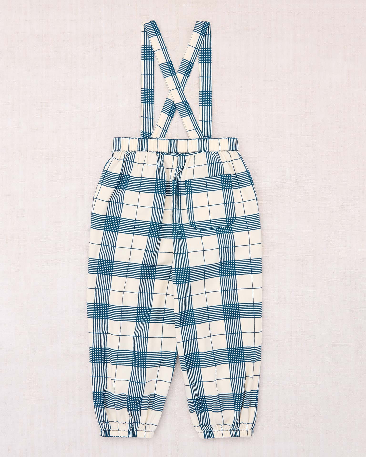 A loose-fitting pull-on pant with attached suspenders in cotton twill, featuring a balloon leg silhouette, gathered elastic waistband and hem, two front pockets, and adjustable horn button strap closure. Finished with French seams.