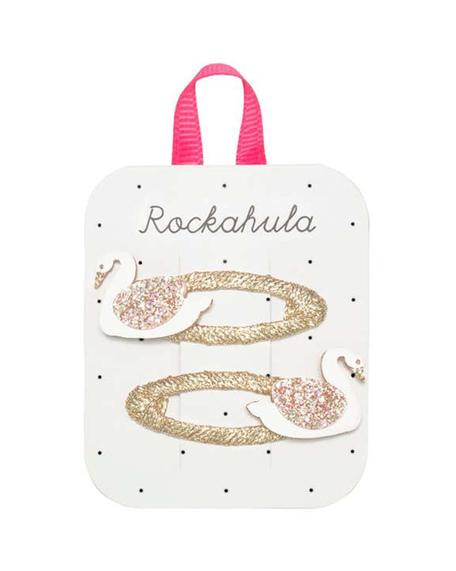 Fall in love with our swan princess and break the evil curse. Two graceful swans in perfect white and gold glitter adorn these gold ribbon wrapped snap clips. Each swan is delicately detailed with little gold wings and a beak.