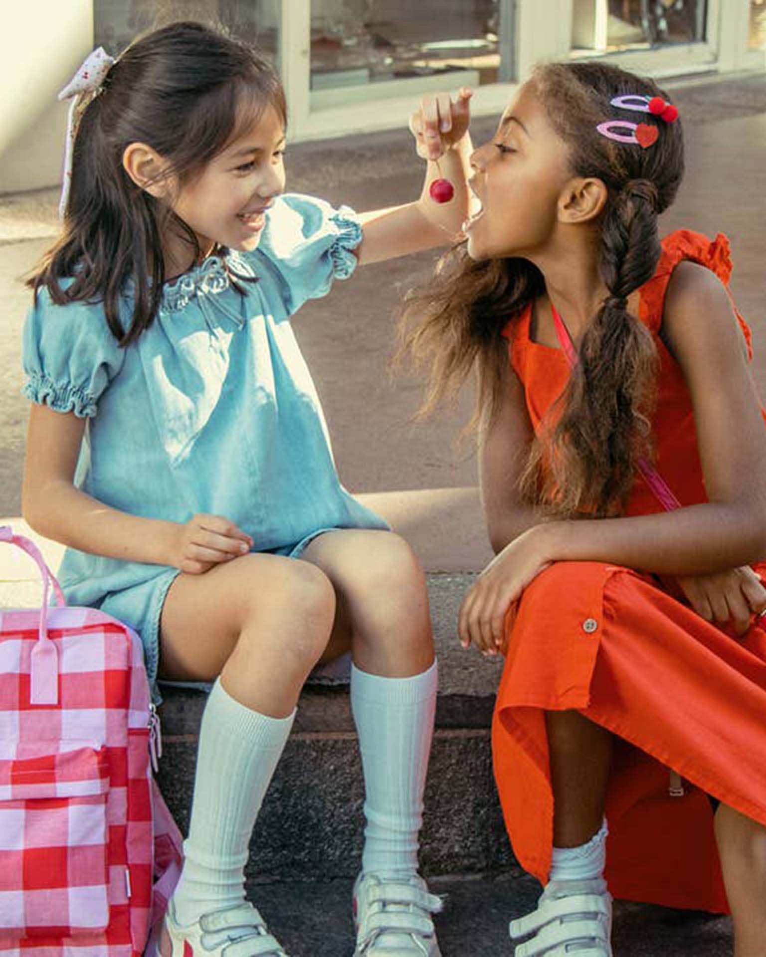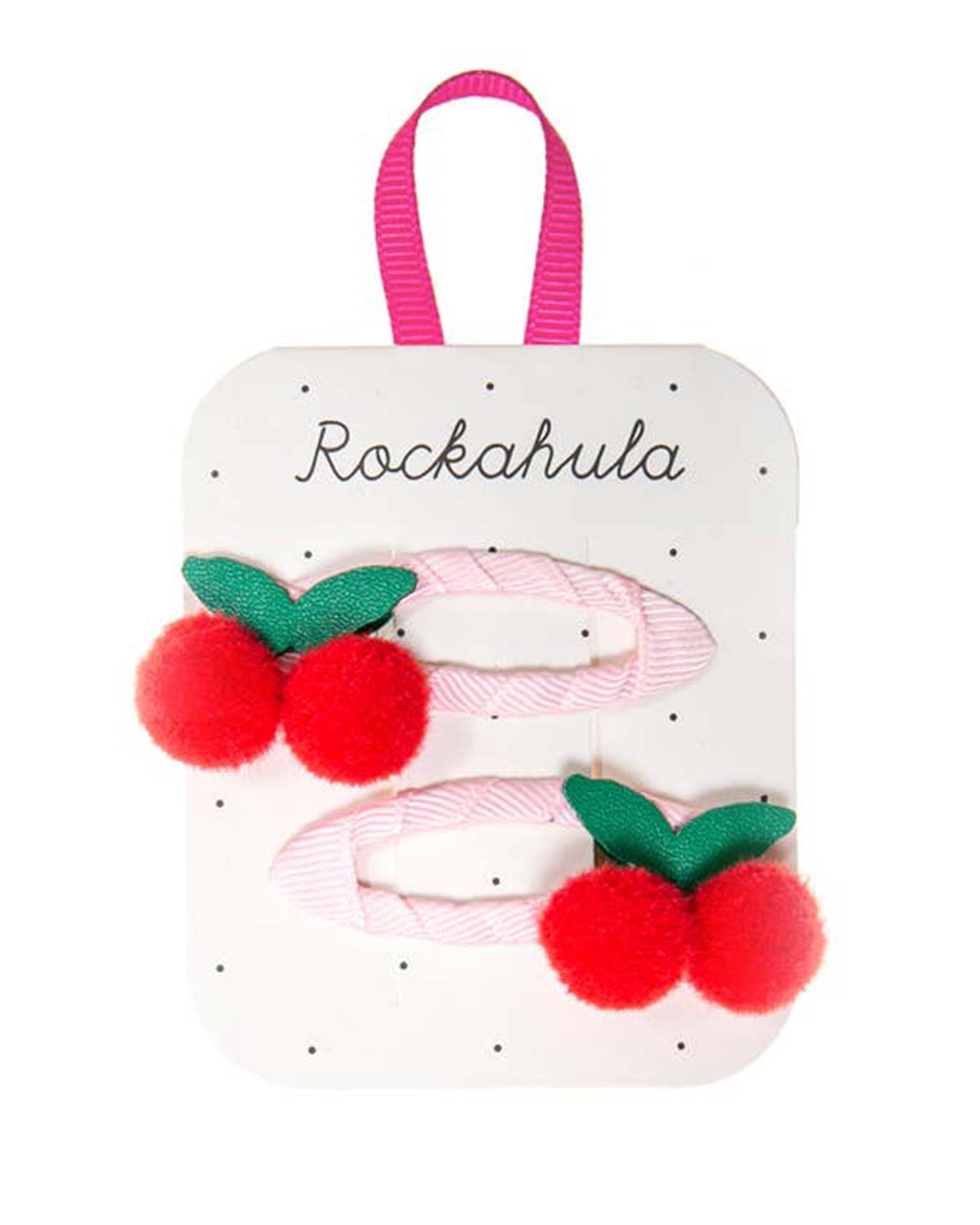 Sweet cherries adorn these pink grosgrain ribbon wrapped snap clips! Each cherry has detailed green stems and delicious red pom pom fruits.