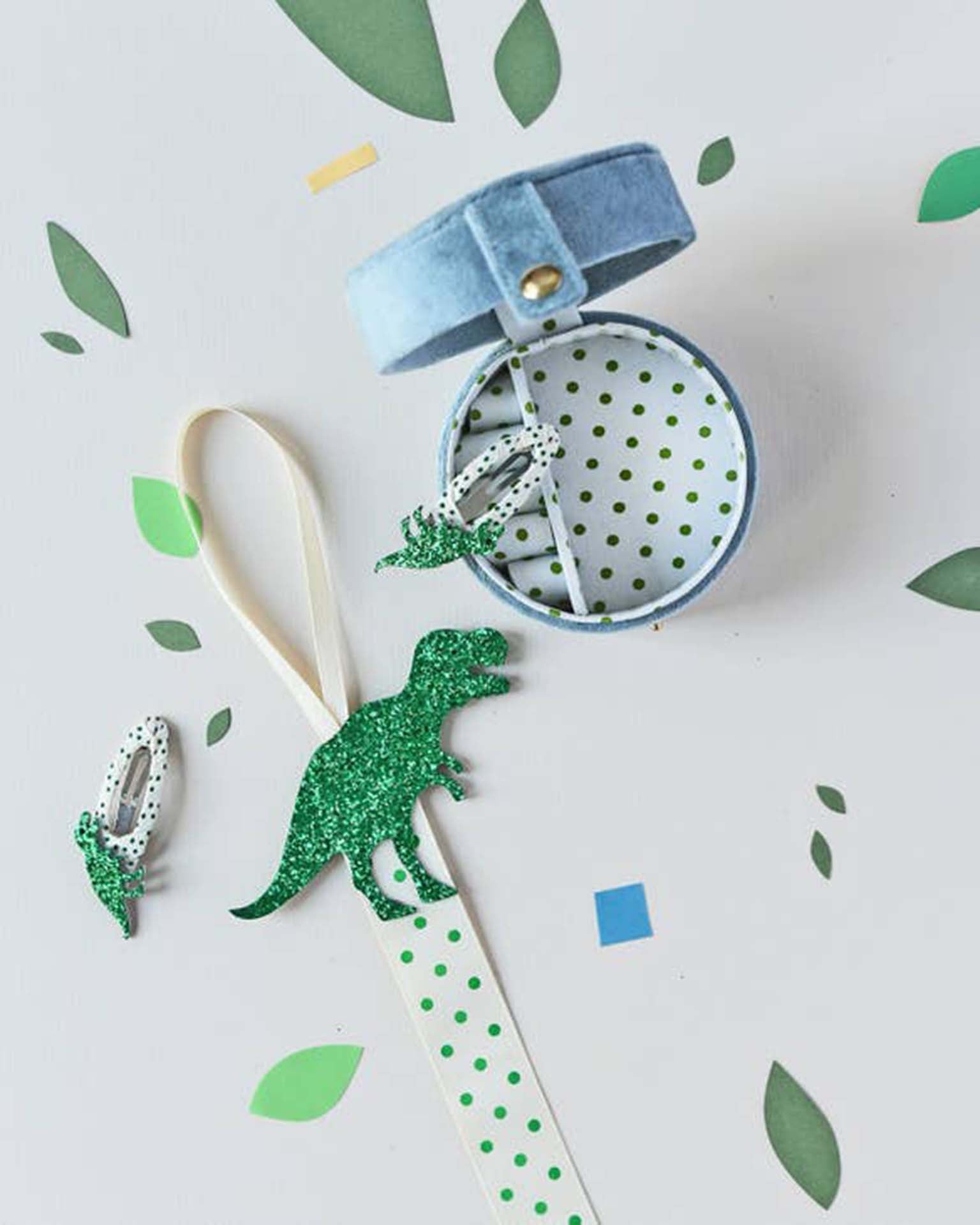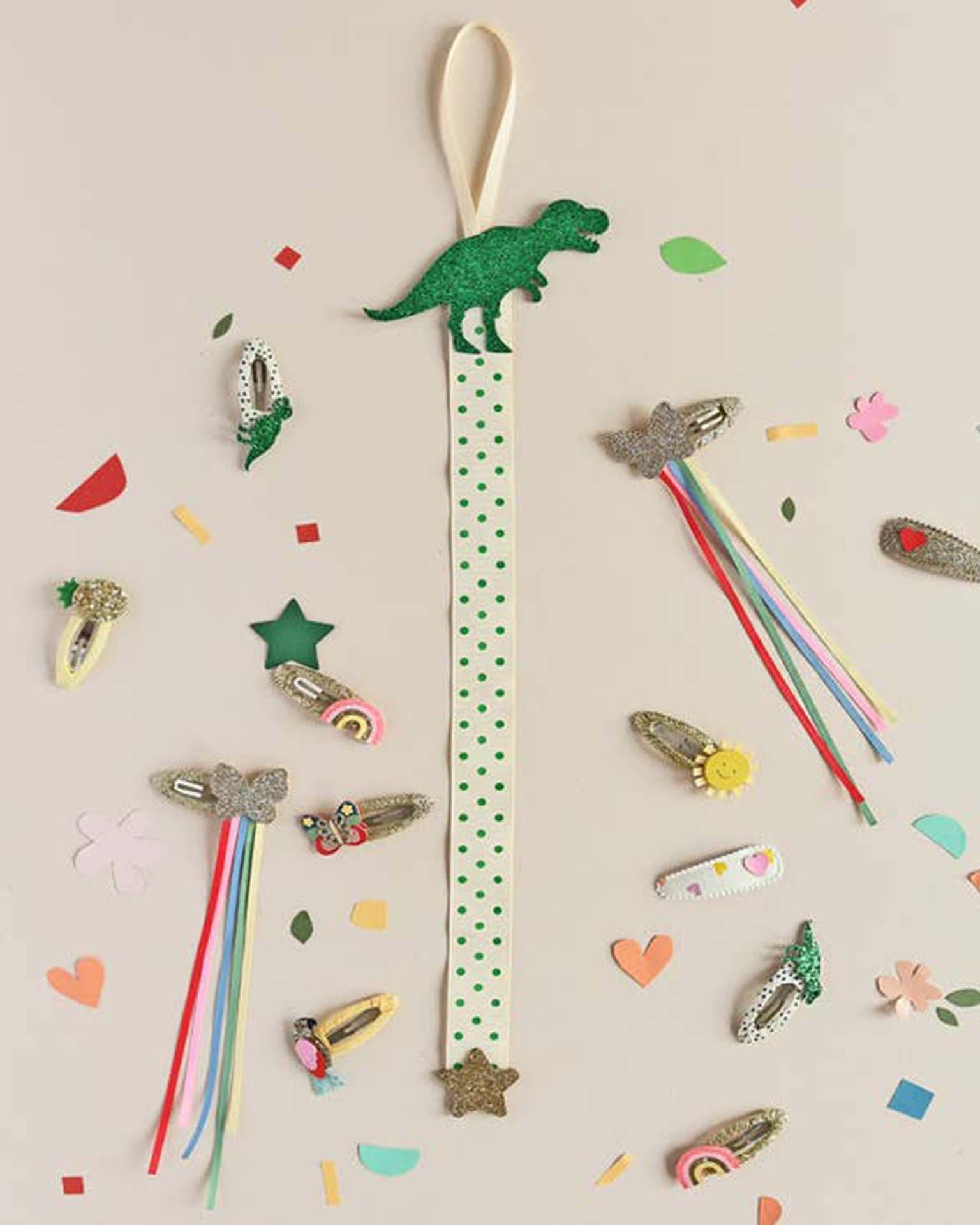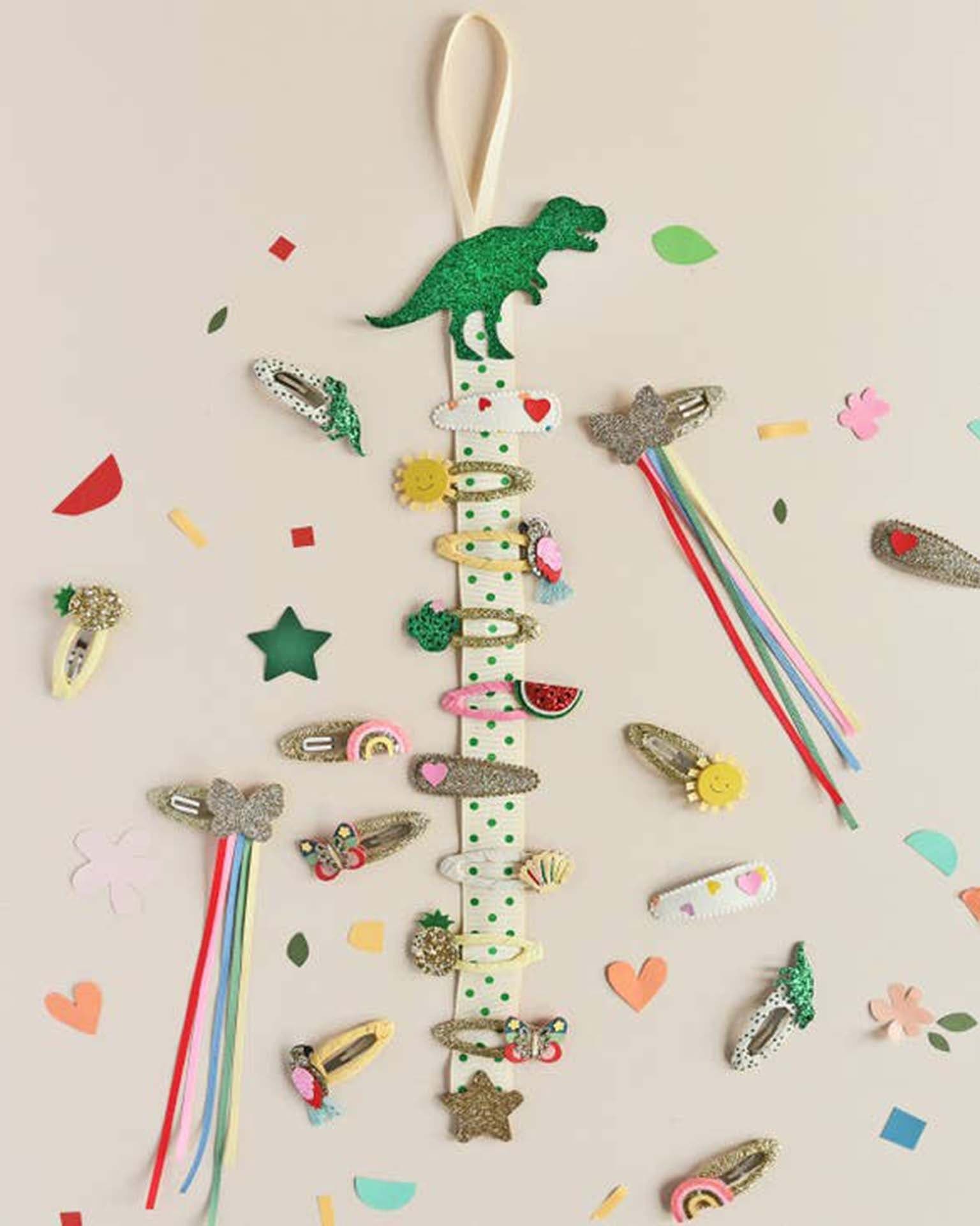 The perfect solution to storing and organizing hair clips in one place - our clip hanger has a hanging loop that can be hung on a door or wall hook. Simply snap on your clips ready to wear again next time! Our dinosaur clip hanger can fit around 12 clips (depending on clip size) and hangs perfectly on a grosgrain ribbon. *Clips not included!