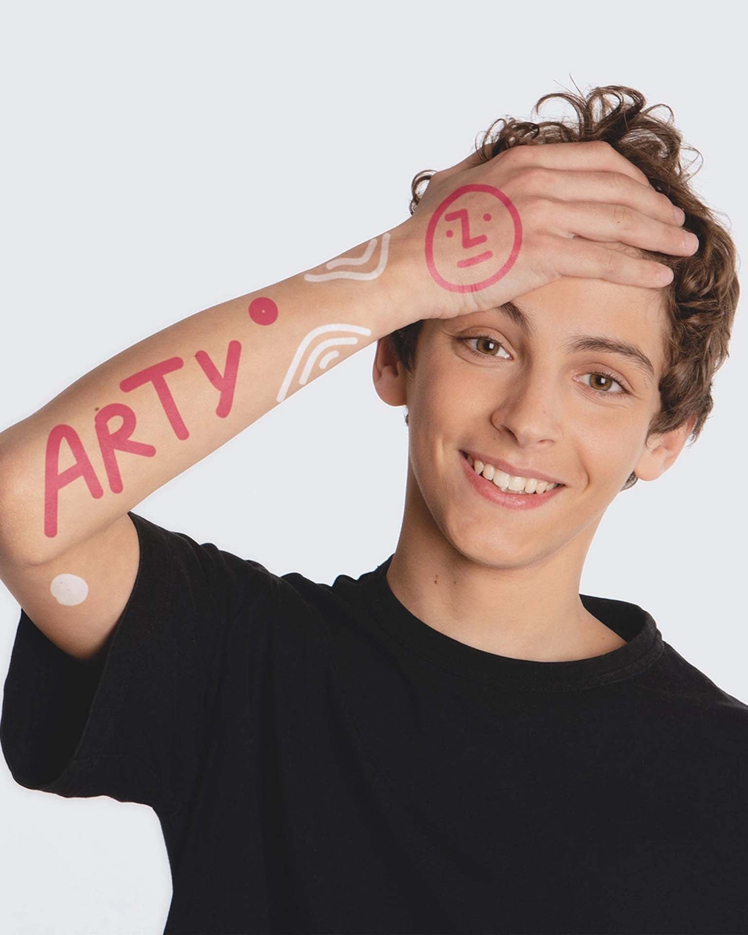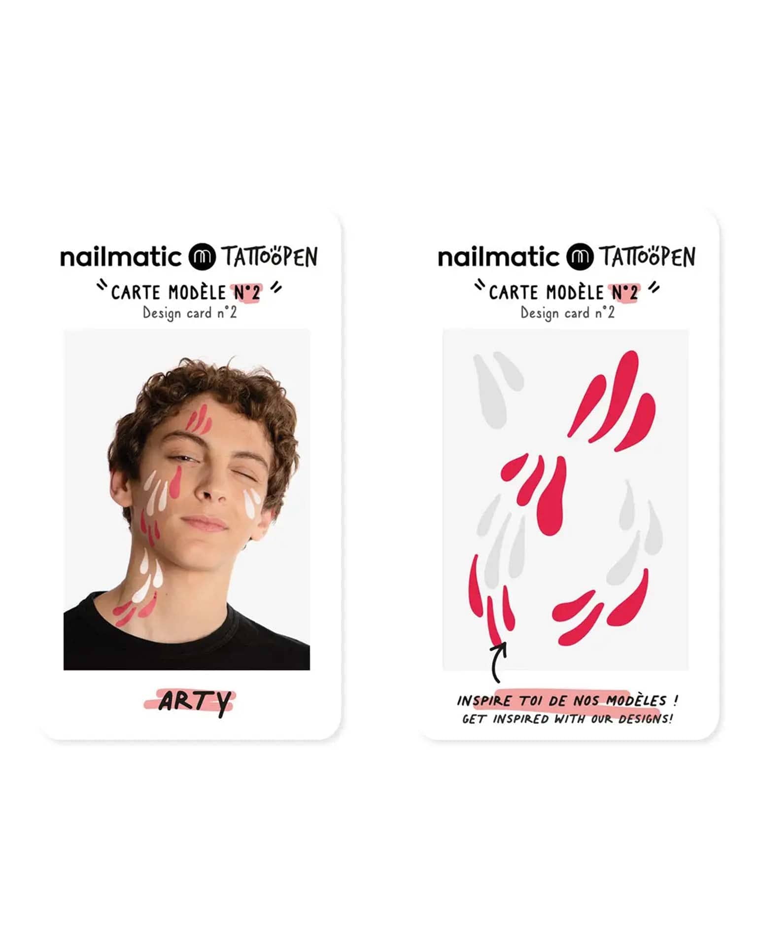 2 temporary tattoo pens and template cards to inspire budding young artists! Looking for a gift that will fill them with joy? Take them on a superfun colourful adventure: drawing on skin.