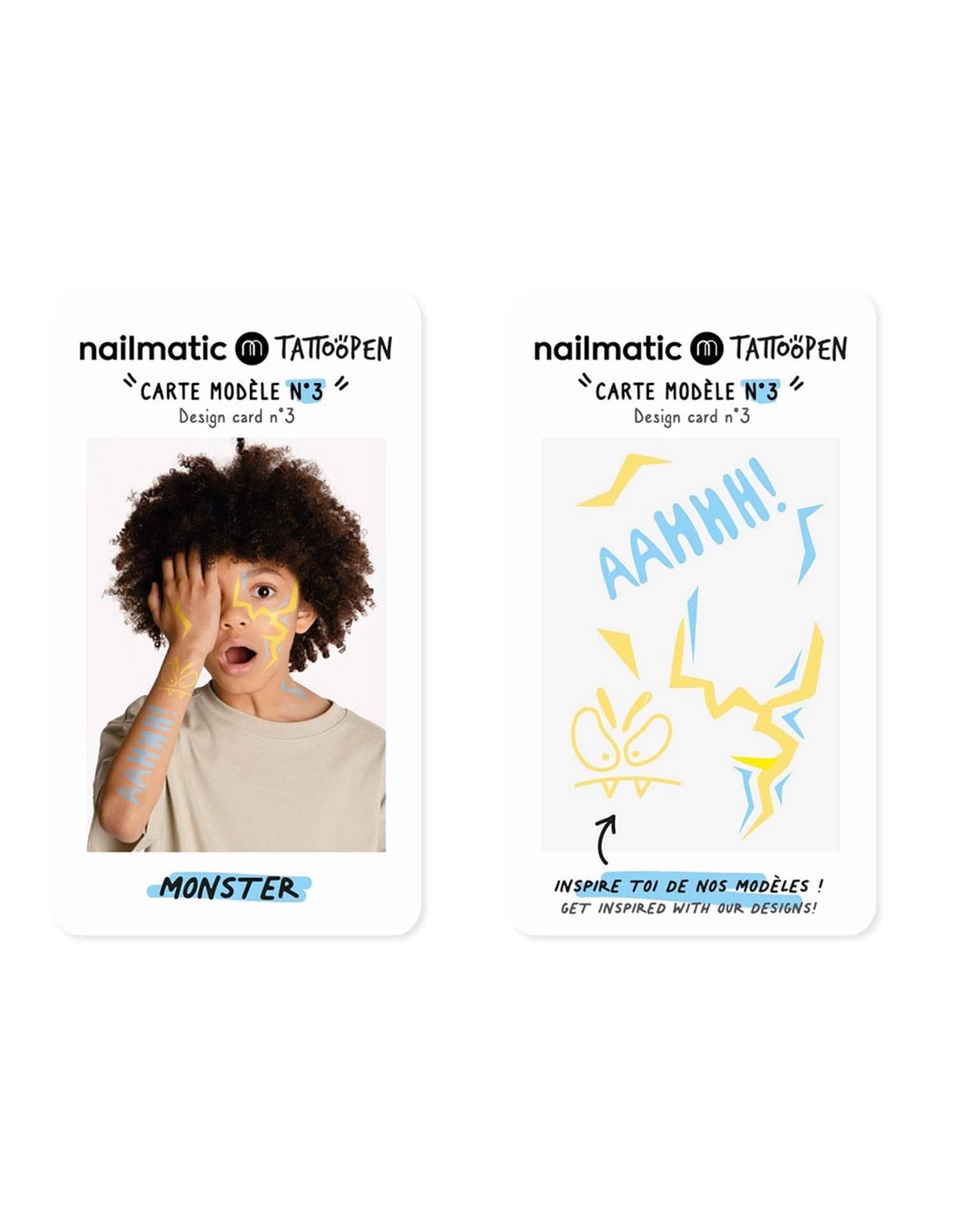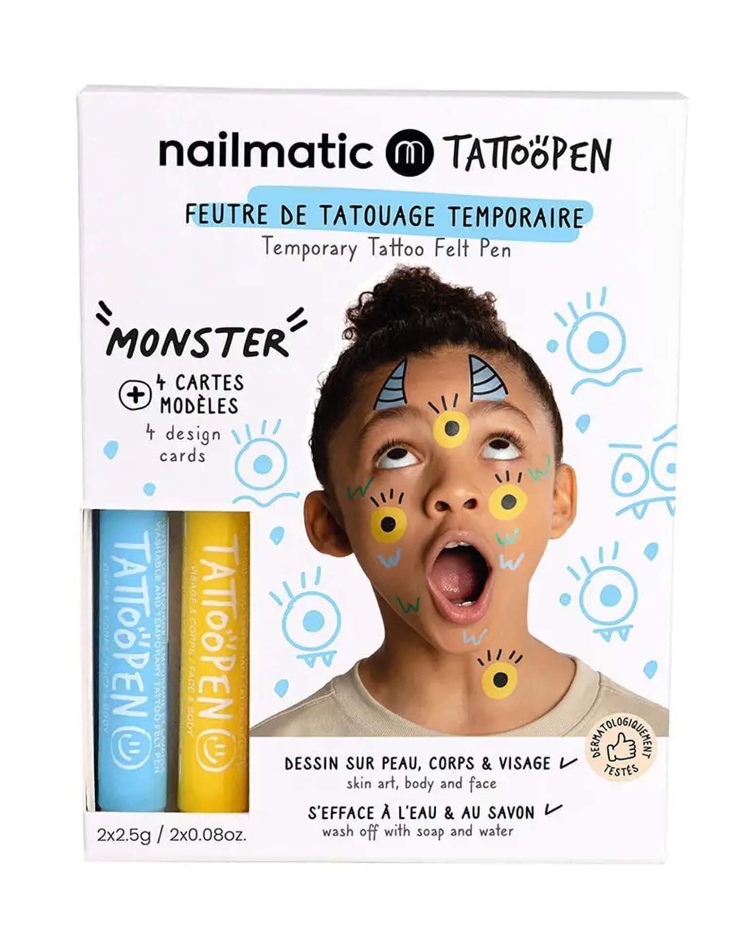 2 temporary tattoo pens and template cards to inspire budding young artists! Looking for a gift that will fill them with joy? Take them on a superfun colourful adventure: drawing on skin.