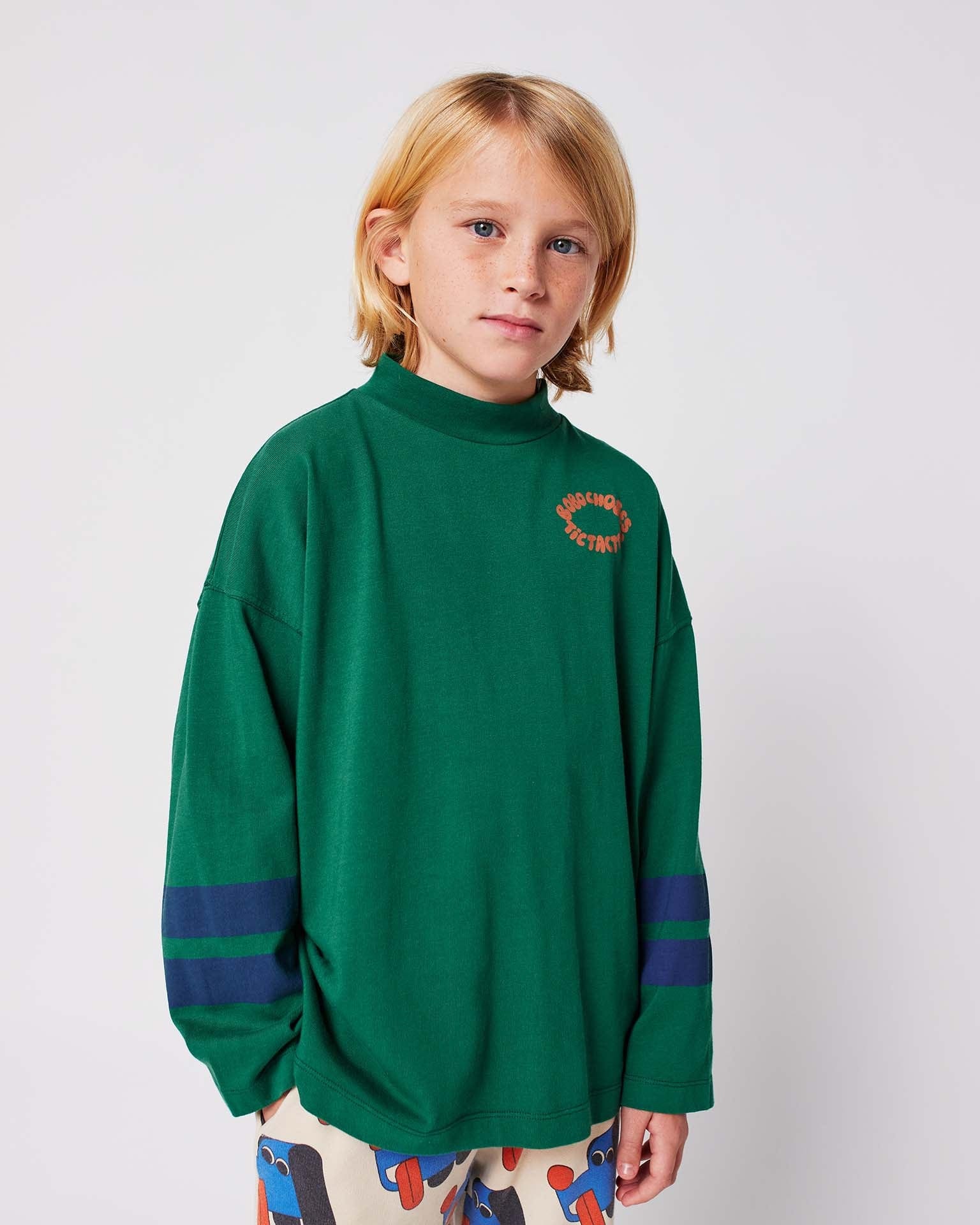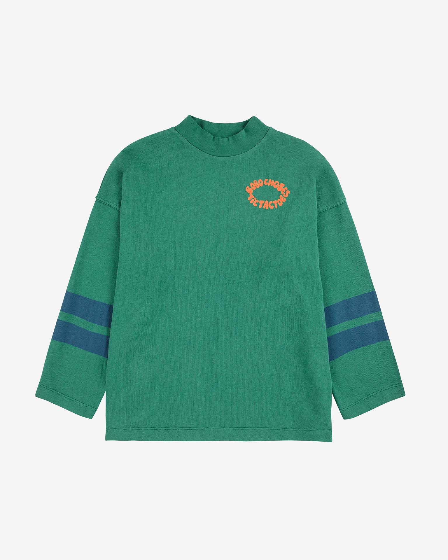 This long-sleeved t-shirt features sporty stripes on the sleeves and a mock neck. The green and blue colors make this shirt easy to pair with any bottoms from the AW25 tic-tac-toe collection.