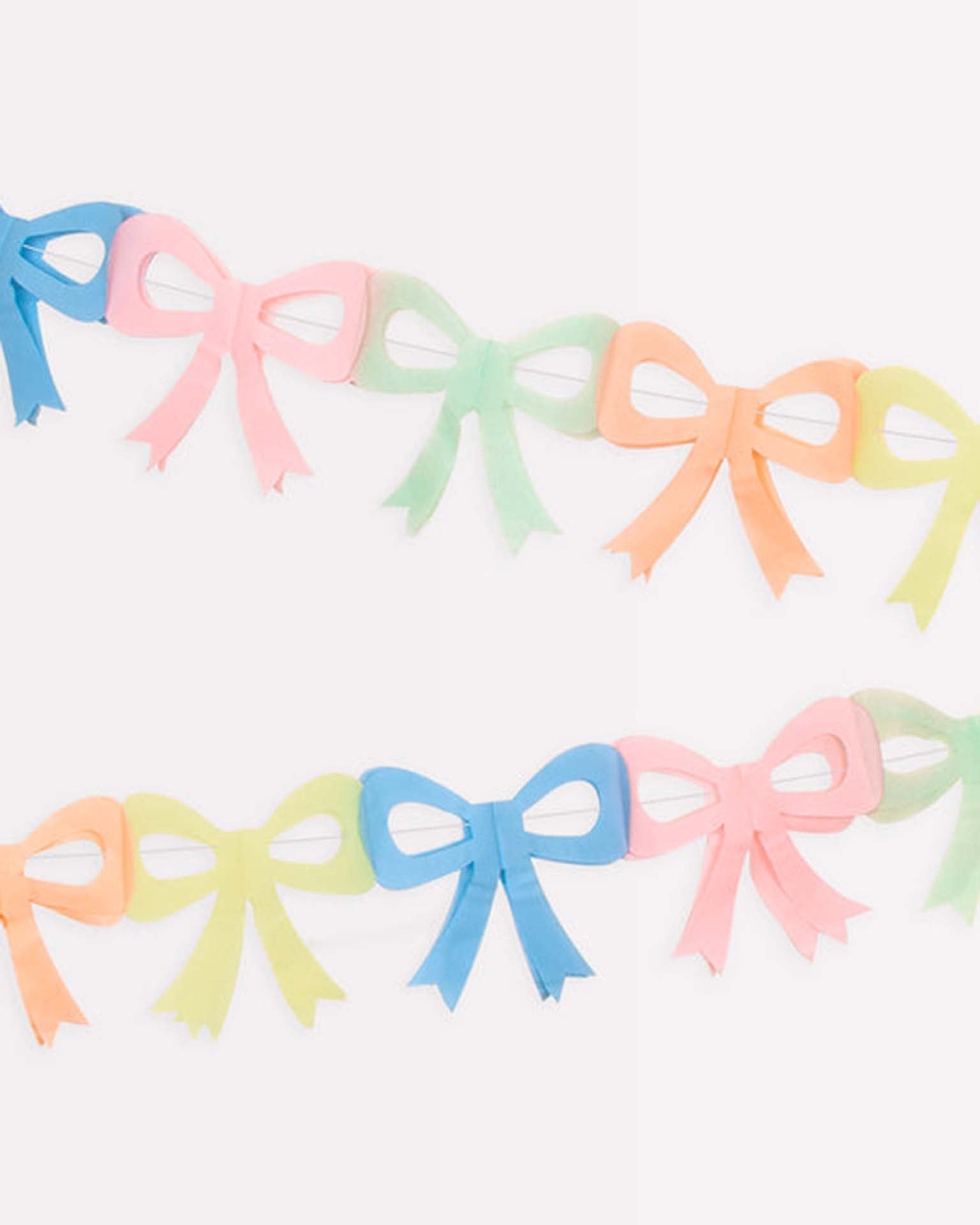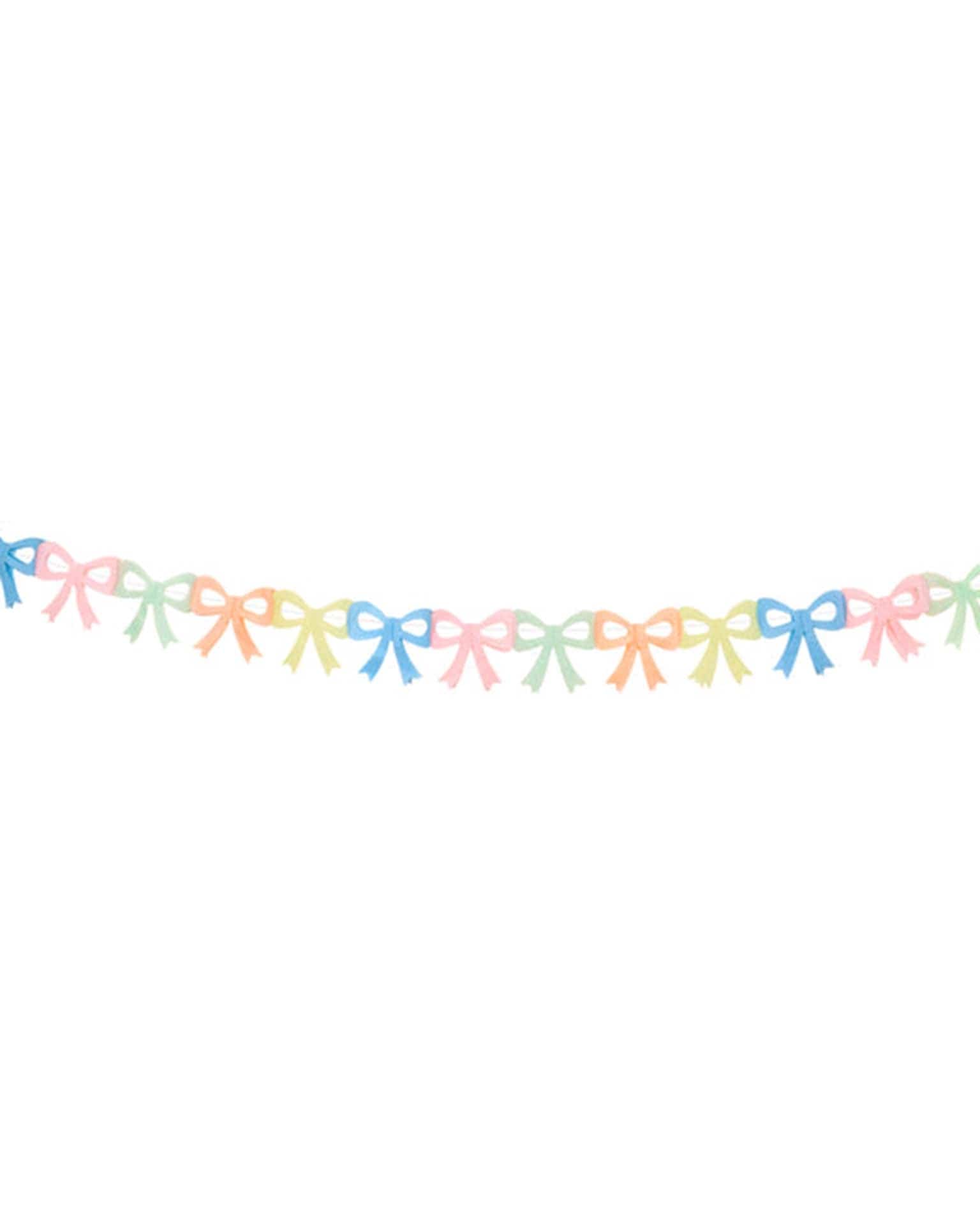 - Includes 3 garlands each with 15 tissue paper bows in 5 colors - pale yellow, blue, pink, mint and peach