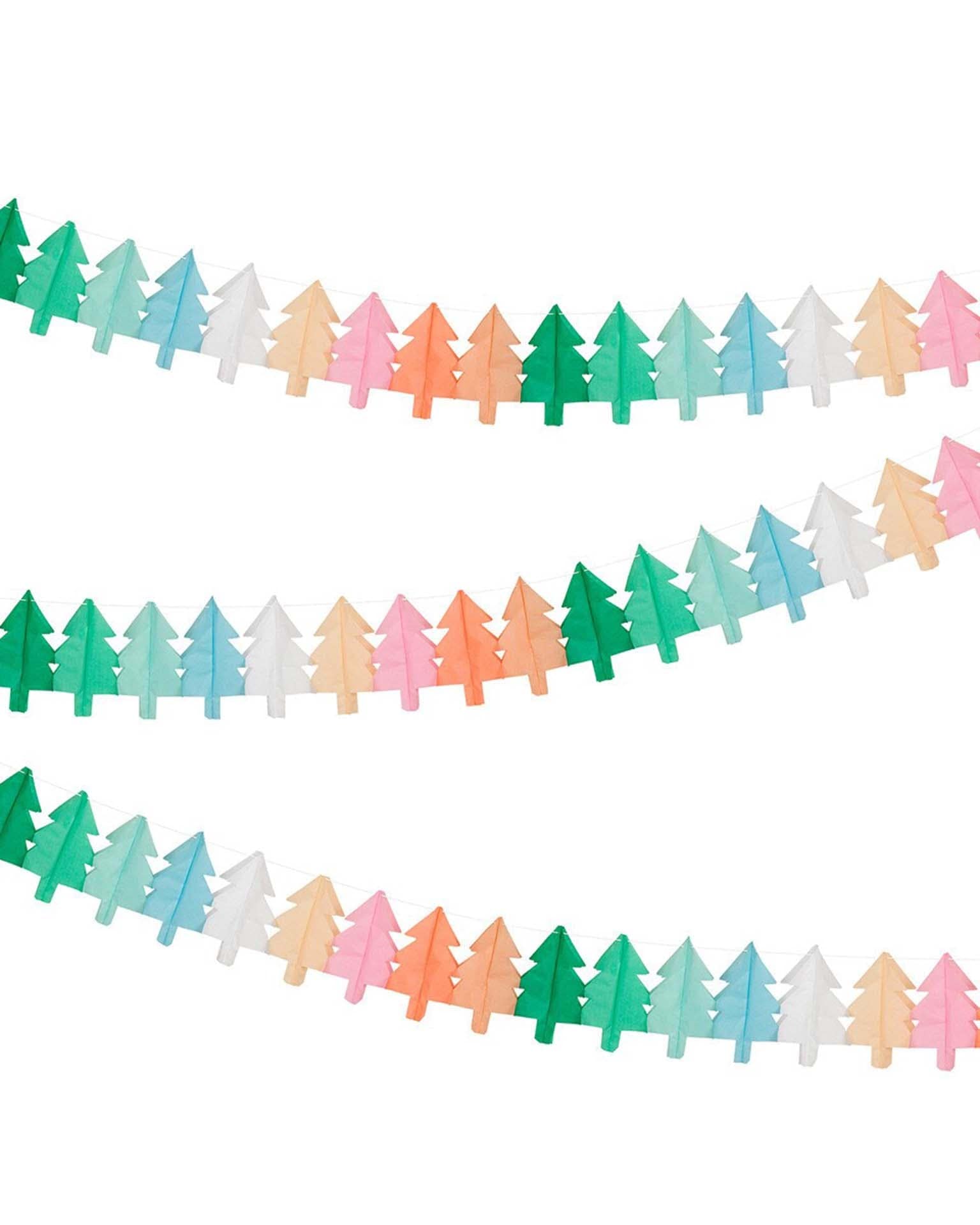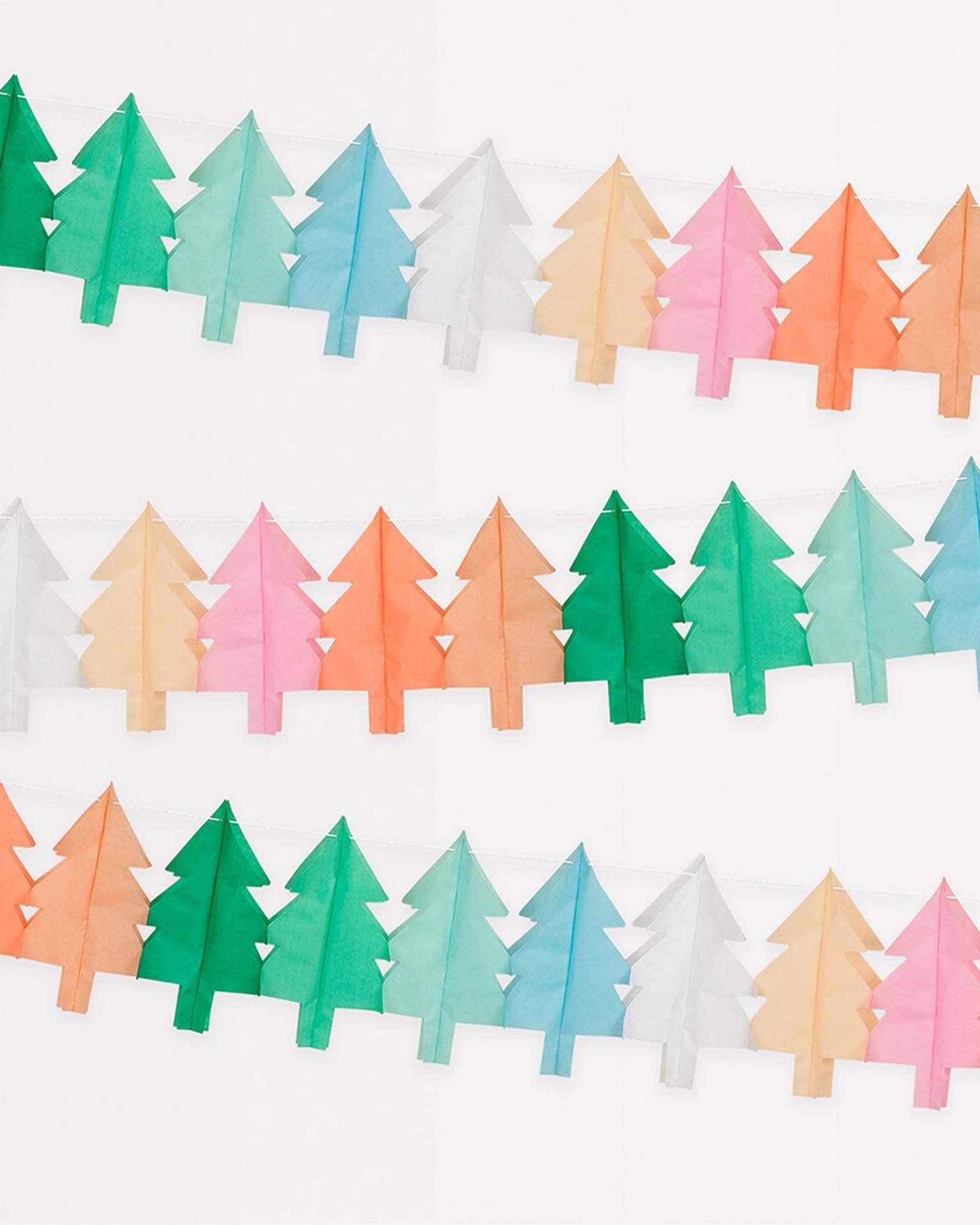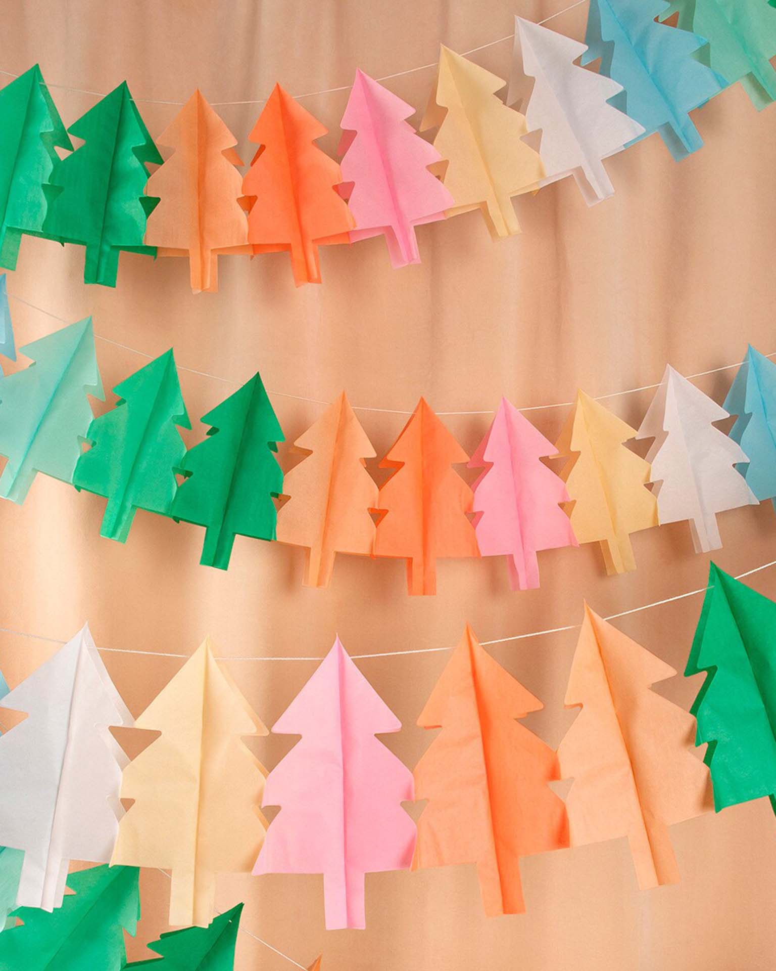 We've taken traditional tissue paper Christmas tree garlands and given them a sprinkling of Meri Meri design magic. Not just green, this colorful set also includes pops of pink, blue, peach, neon coral, yellow and white. They're perfect to hang in your doorway, on the wall or mantel, or to drape on your party table – wherever you want a modern merry and bright look. Hang them separately, or all together for a statement effect. Great to reuse year after year.