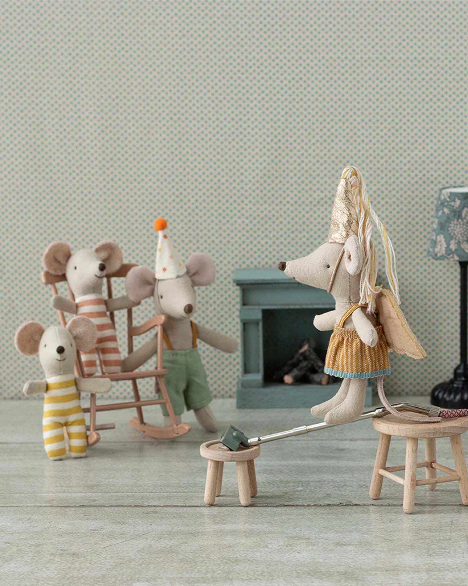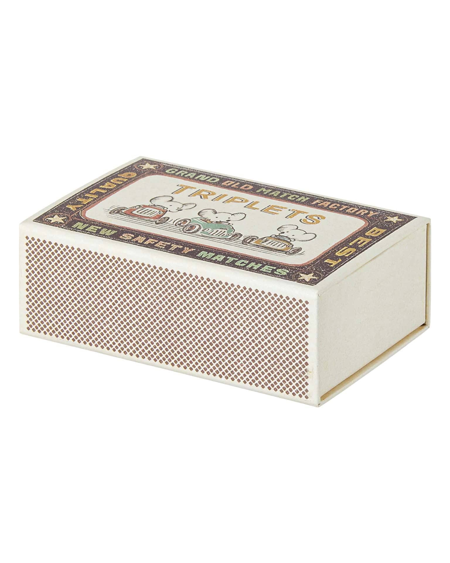 Surprise! It's triplets! Not two, but three baby mice in a box! They cosy up together in their box to sleep and keep their mummy on her toes during the day. Dressed in complementary stripes, they come cuddled together in blanketed pockets.
