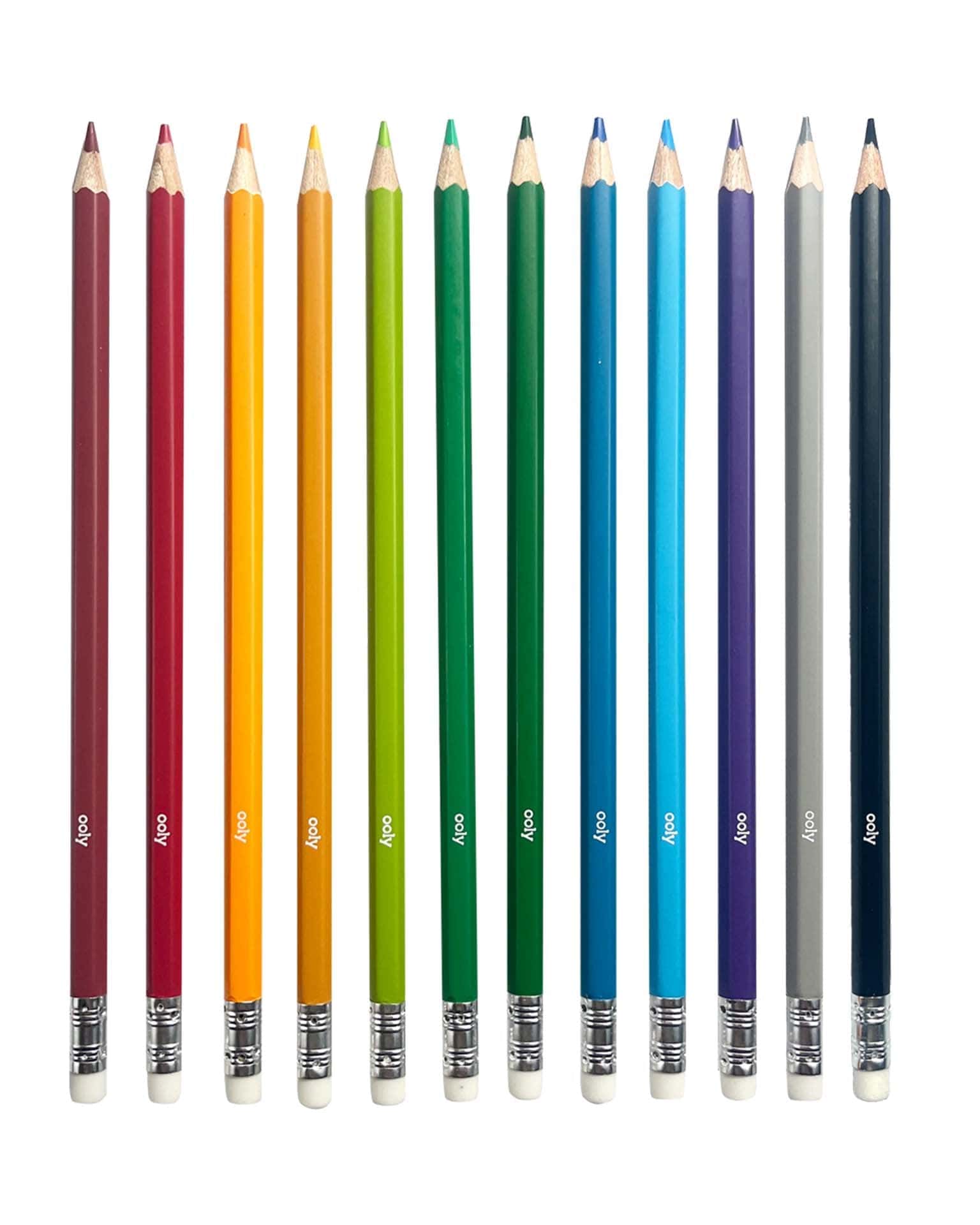 - Pencils include a rainbow of colors including red, blue, green and yellow