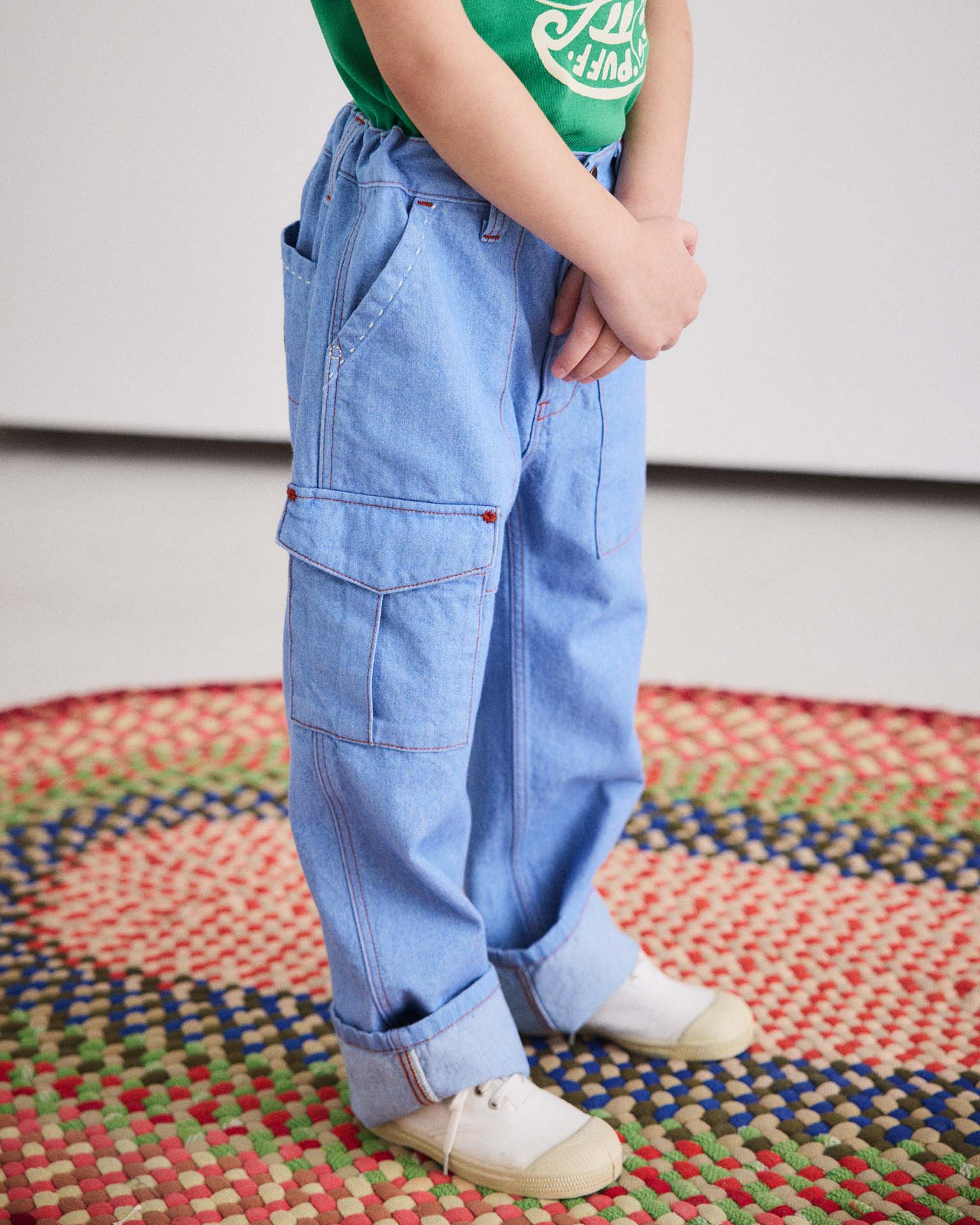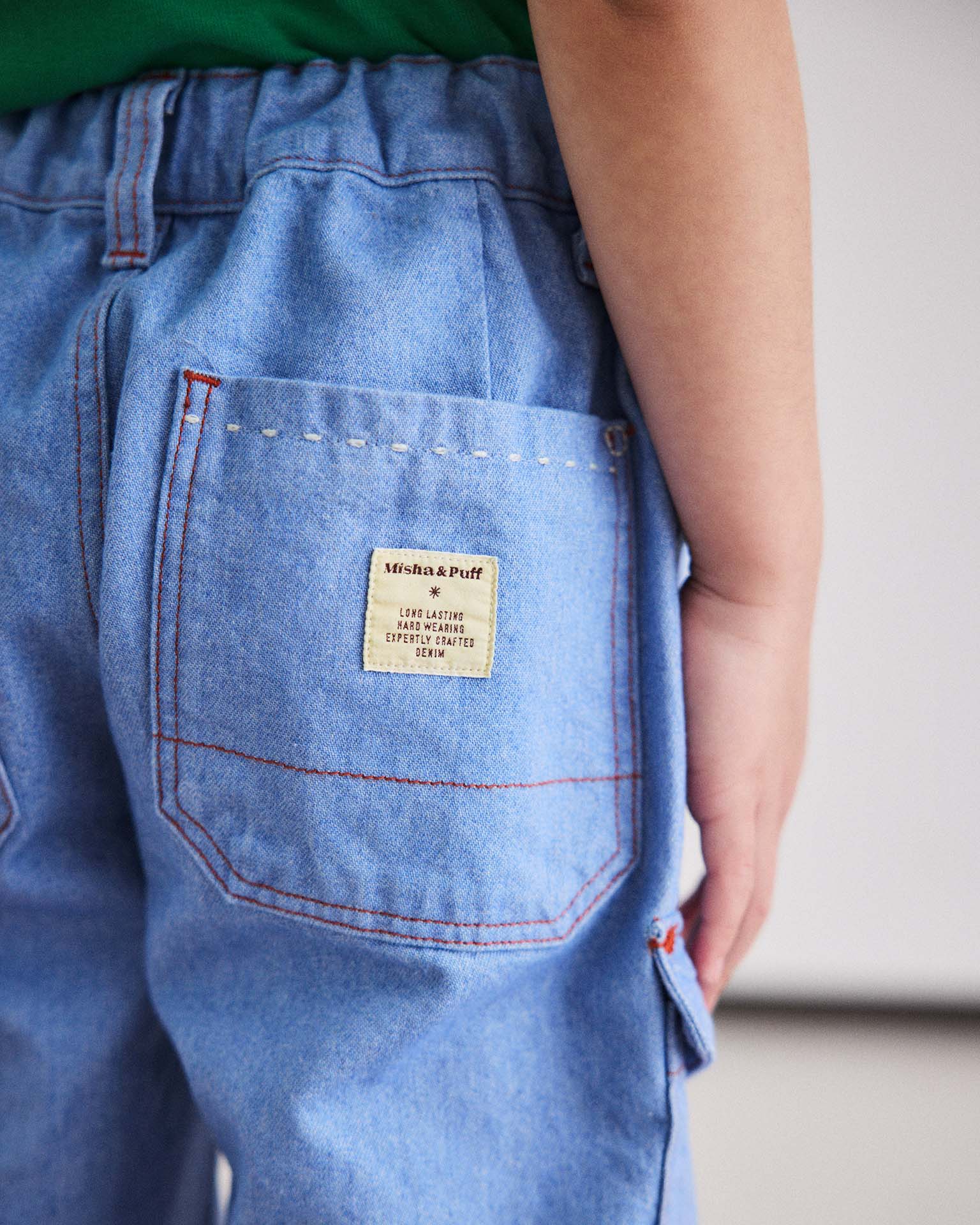A relaxed tapered-leg jean in 100% cotton denim, featuring four standard pockets, one utility cargo pocket, contrast topstitch detail, and a hidden interior adjustable waistband for the perfect fit. Finished with hand-tacked stitches instead of rivets for softness.