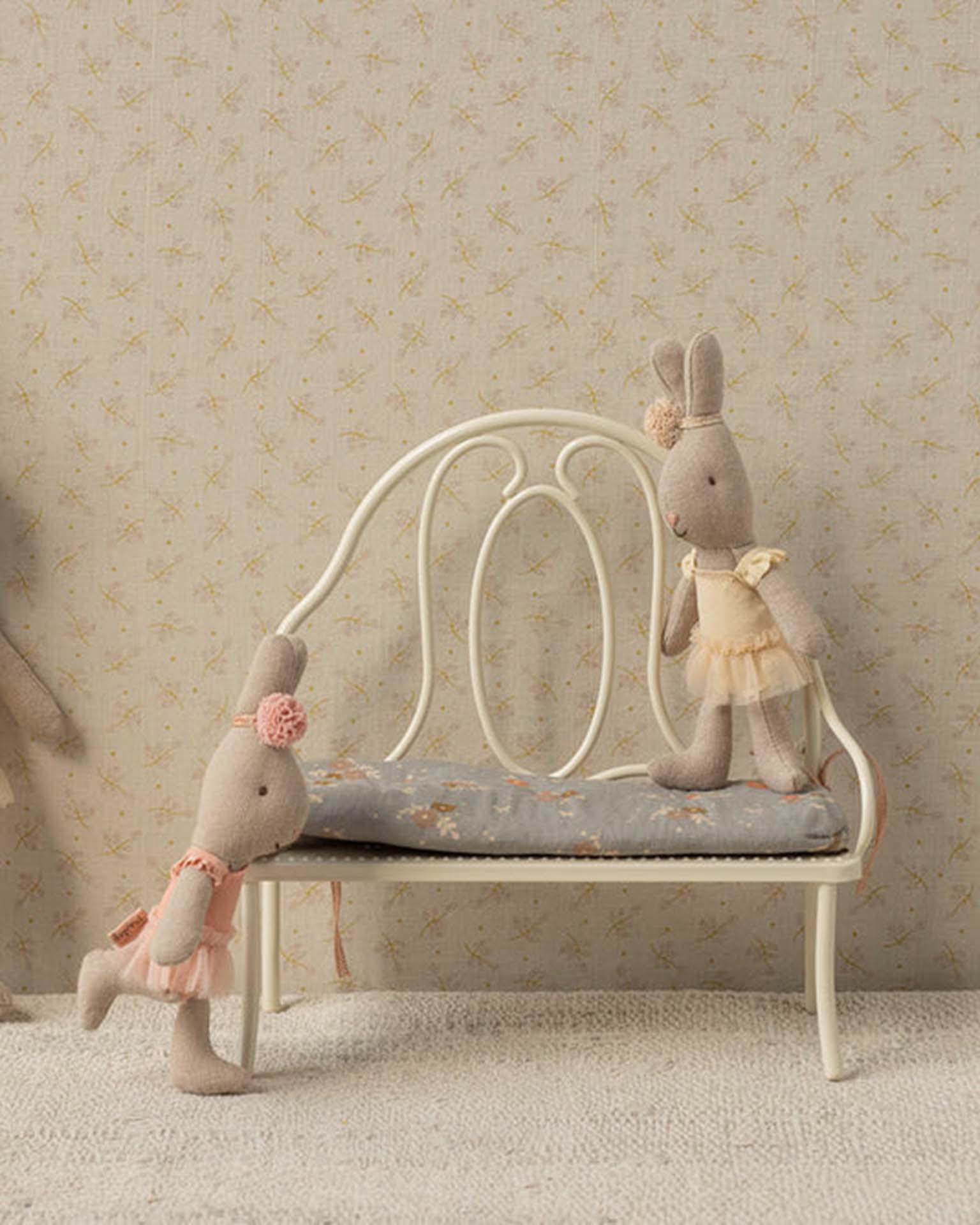 The beautiful vintage bench comes with a soft cushion to secure a comfortable seat. The bench is perfect for a short rest and fits perfectly for the bunny and rabbit size 1 and 2.