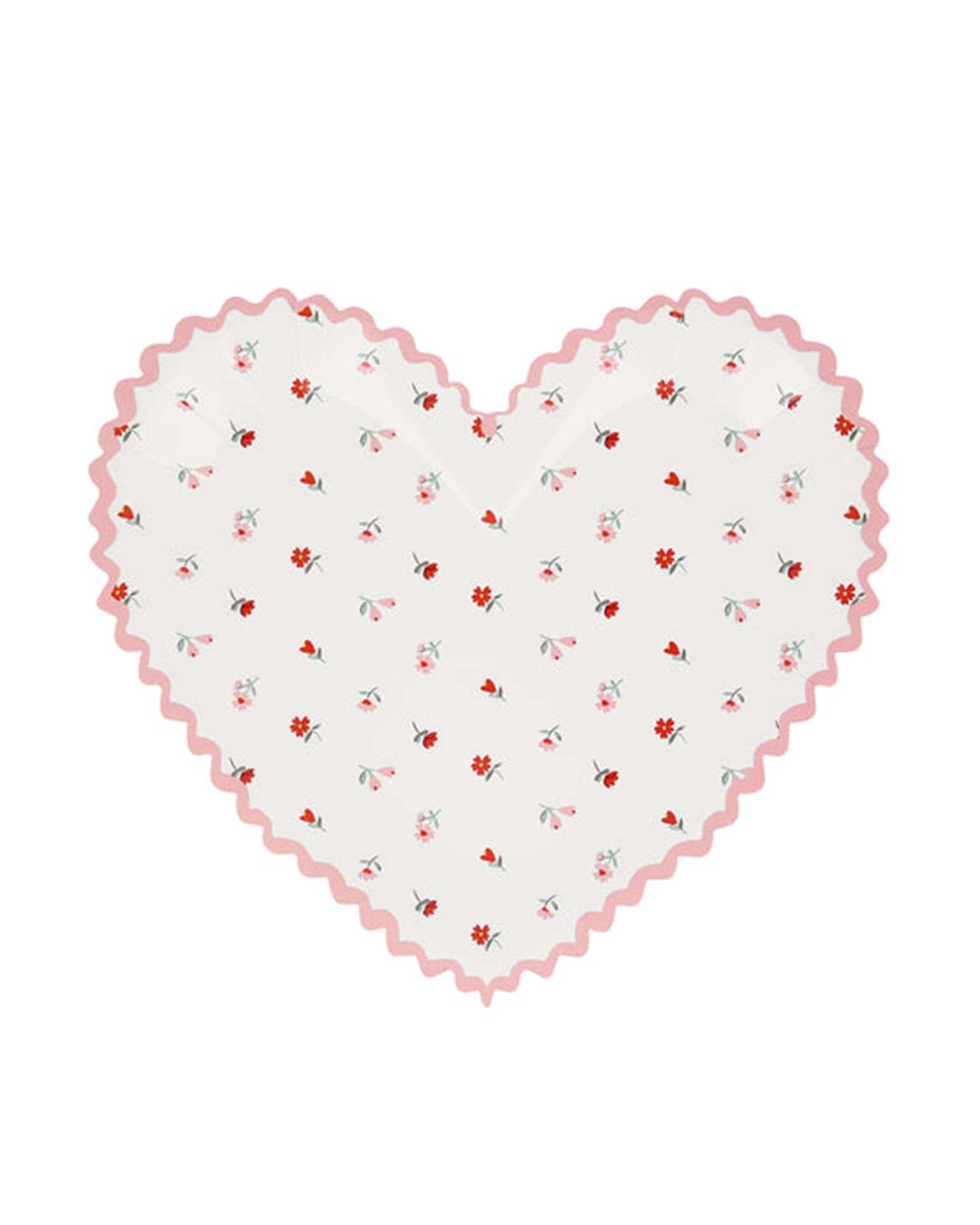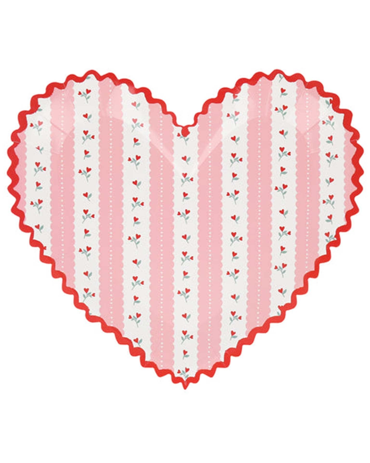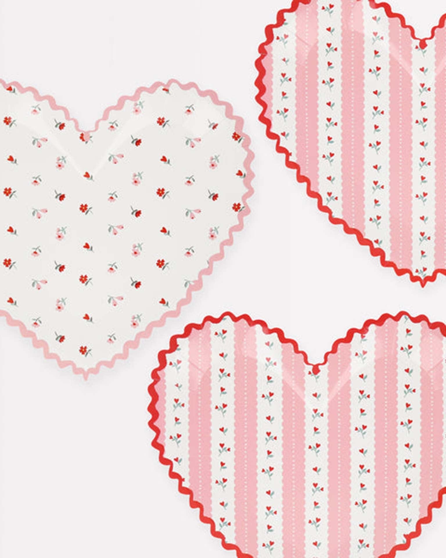 These beautiful vintage-inspired designs, based on antique floral wallpapers and tablecloths, are perfect for setting the mood for a romantic celebration. Look closely, and you'll notice that the red rose pattern features heart-shaped buds. This attention to detail, combined with a fabulous ricrac border, makes these pink and red Valentine's heart paper plates so special.