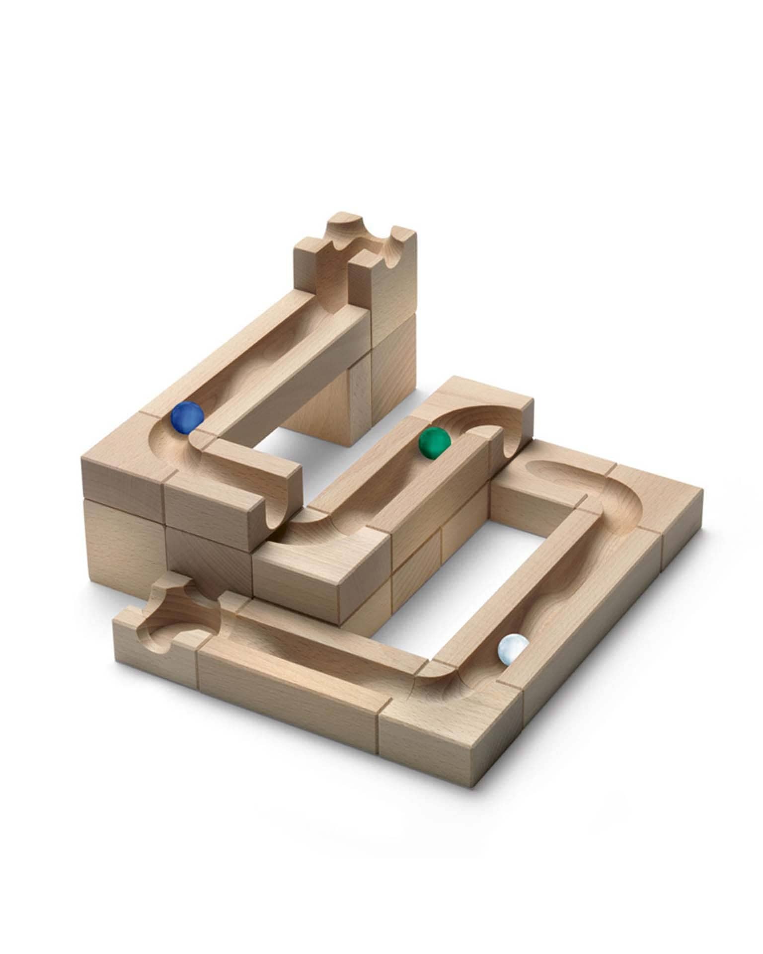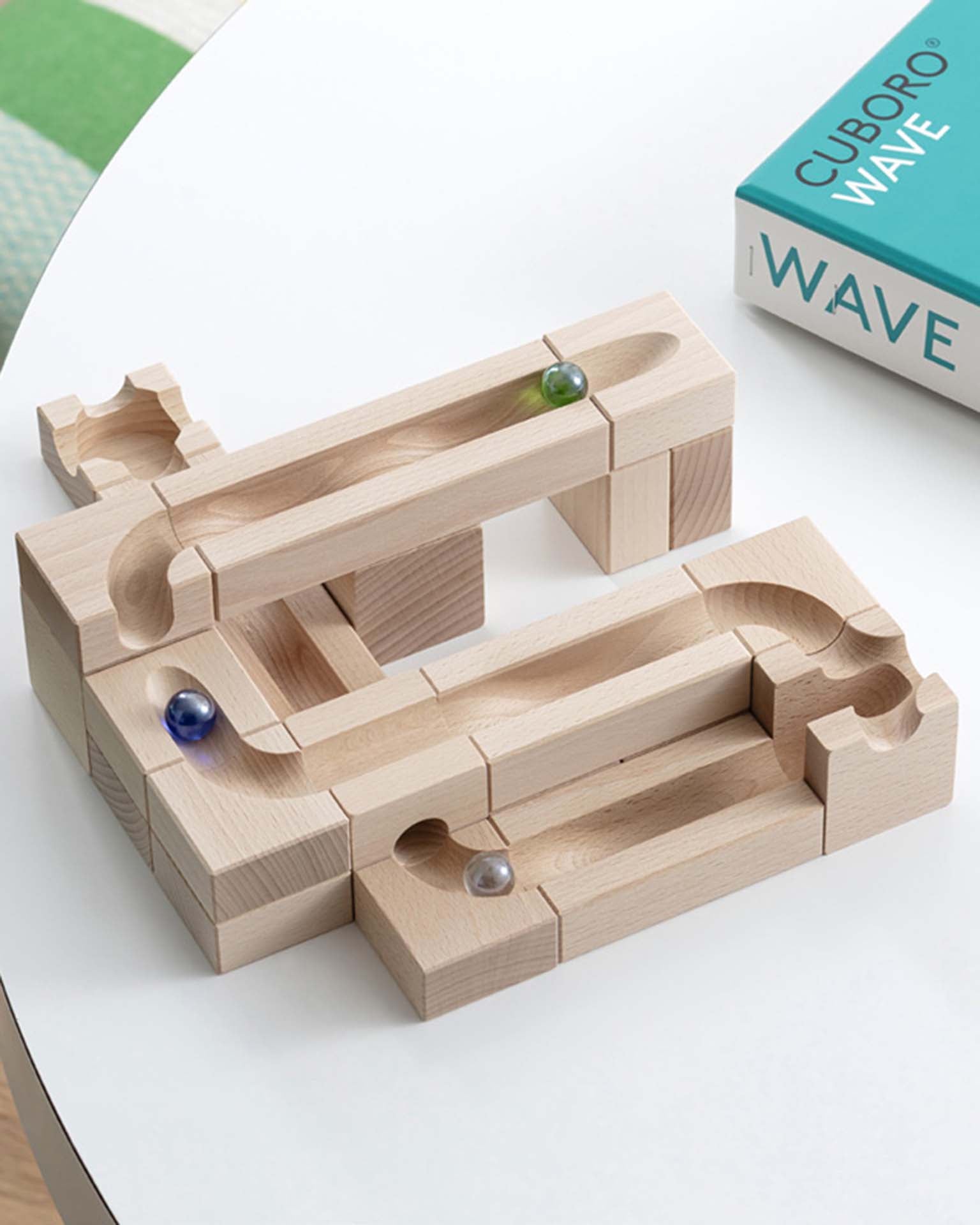 The latest addition to the Cuboro system, WAVE elements add a special flow to your marble run. The marble glides smoothly up and down the wavy grooves before rolling gently to the next level. Extra Sets expand the Starter Sets and offer additional fun. The WAVE Extra Set works great with other CUBORO sets – but also works independently as a compact introduction to the creative marble run system.