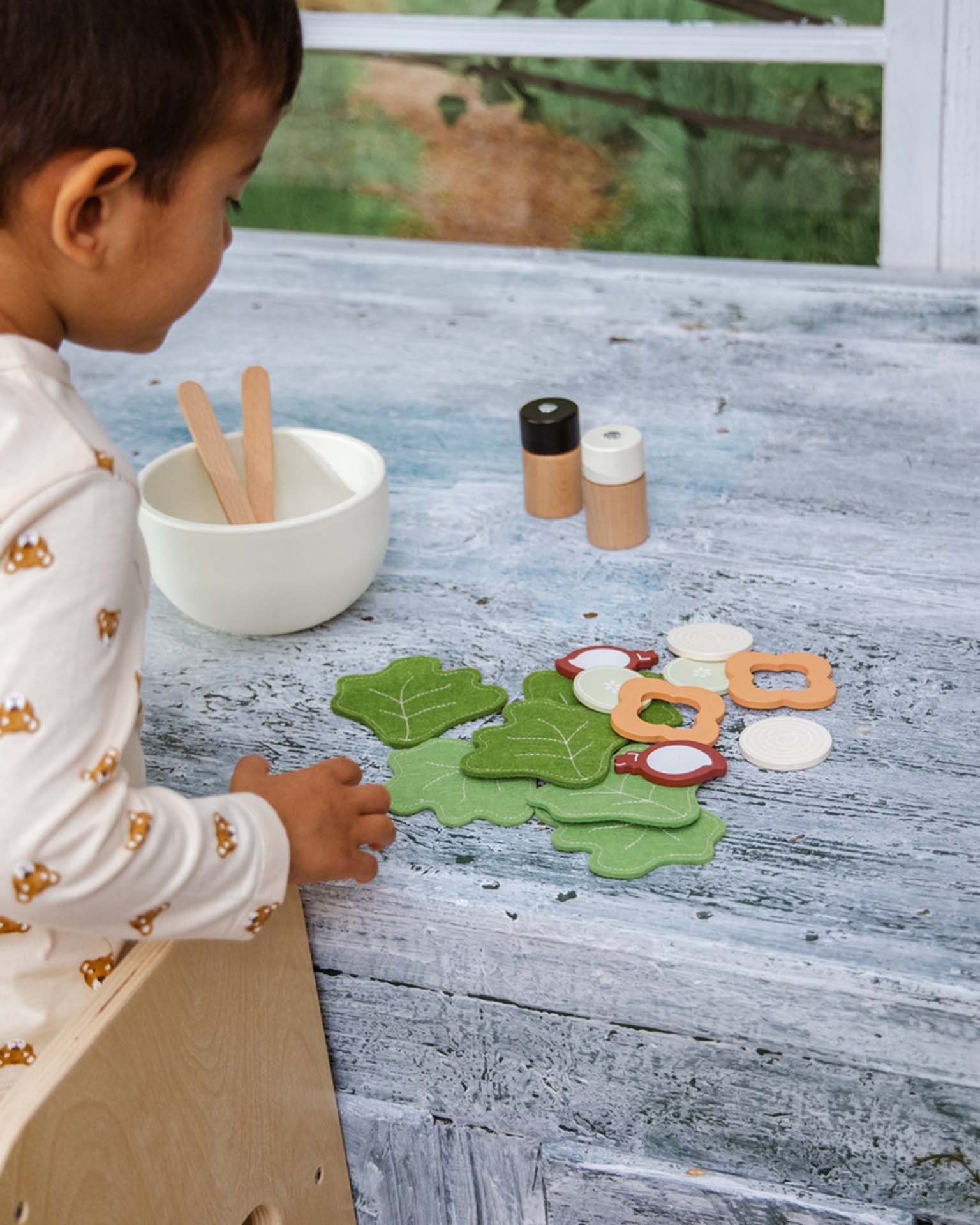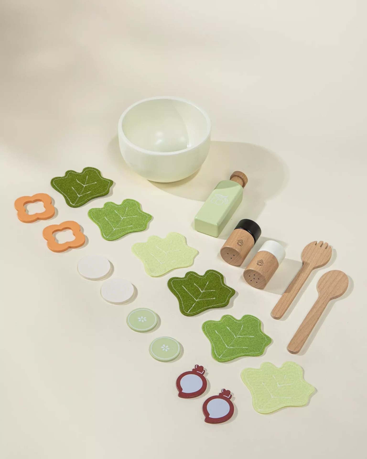 Introduce healthy eating habits to your child's playtime with our Wooden Salad Playset! This delightful kit includes everything needed to create a delicious pretend salad, featuring a variety of felt and wooden vegetables, a salad bowl, utensils, and olive oil and salt and pepper shakers that really click! Each piece is carefully crafted to inspire creativity and imaginative play, encouraging children to role-play as chefs and learn about different vegetables. The Wooden Salad Playset is perfect on it's own, or combined with other pretend play modules, like our Wooden Pasta Playset or our Wooden Pizza Oven Playset. Let your child enjoy the art of making and serving salads, enhancing their social and cognitive skills while having fun.