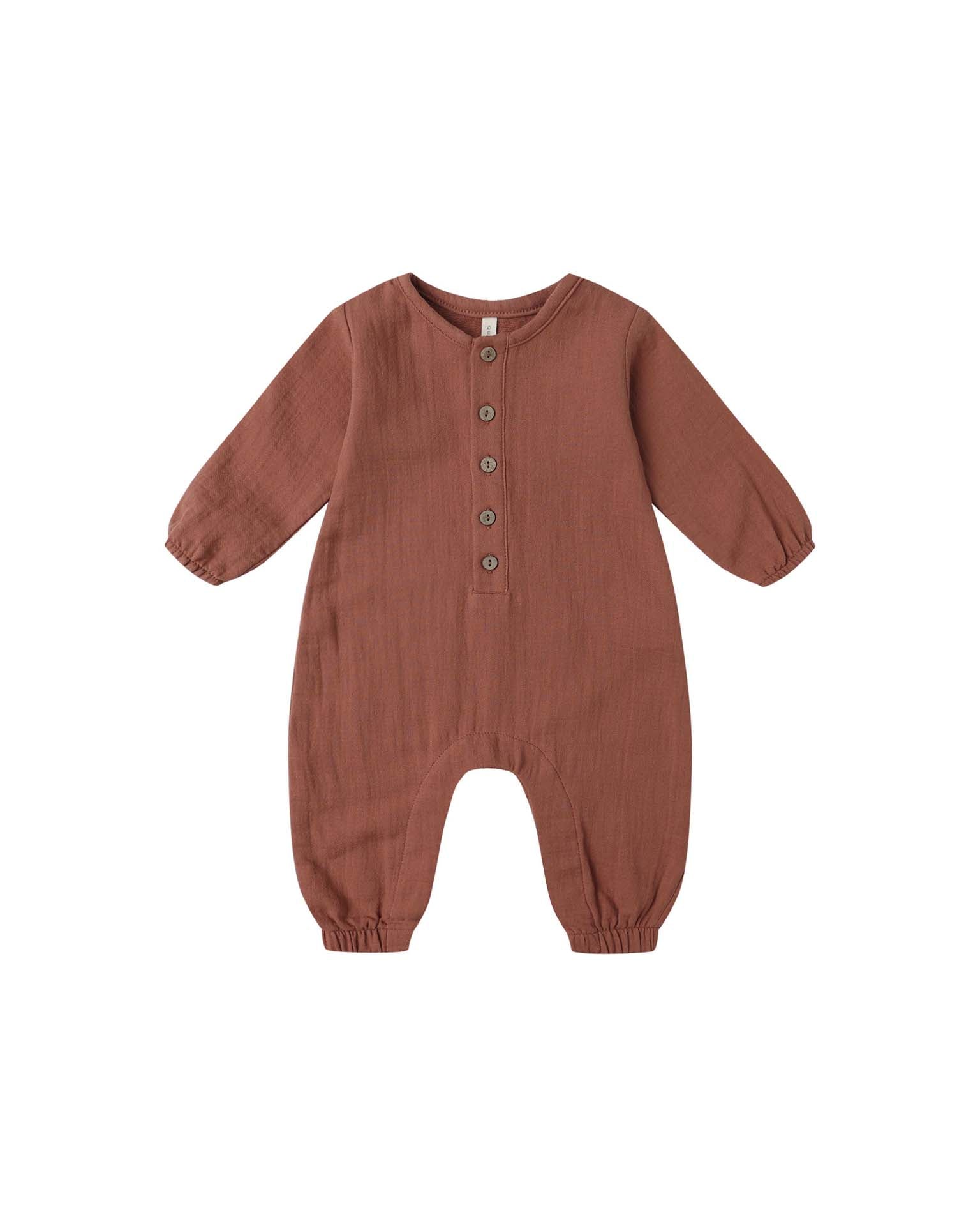 Long sleeve jumpsuit crafted from soft organic cotton gauze, featuring coconut buttons down the chest, hidden snaps along the inseam for easy changing, and elastic at the sleeve and leg openings for a perfect fit.